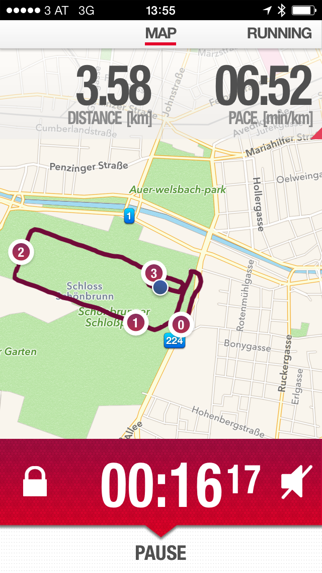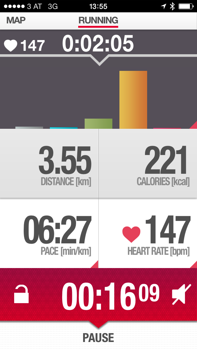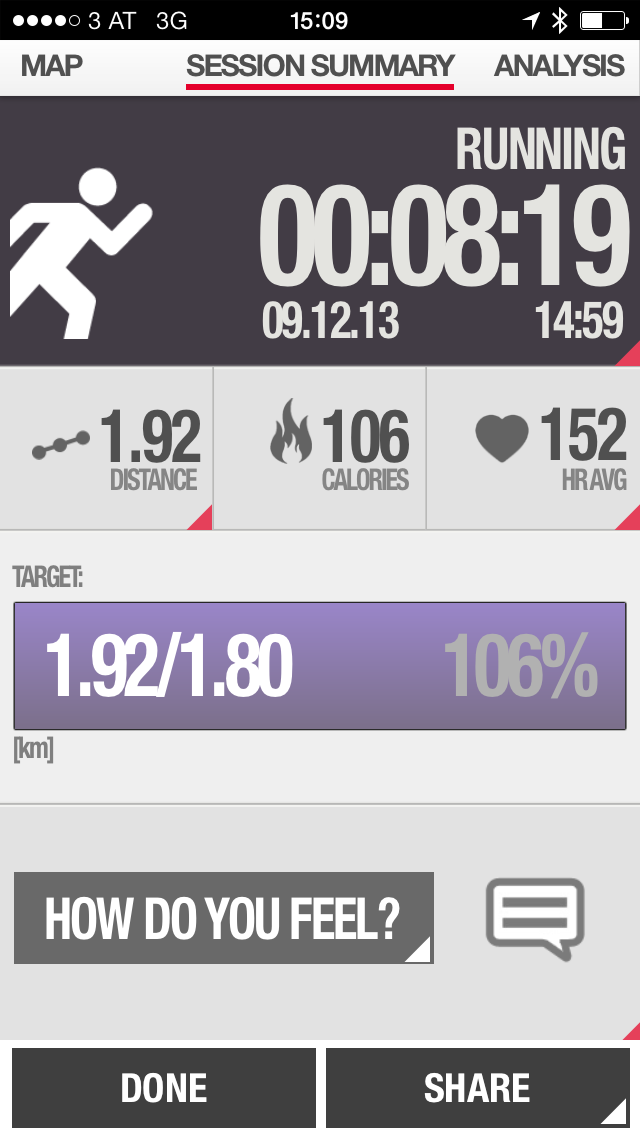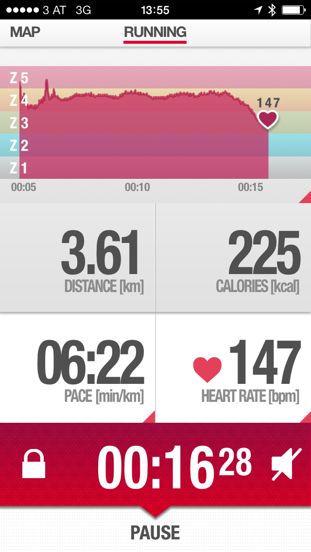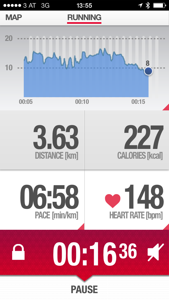Mit der iPhone App gab es zum größten Teil nur minimale Abweichungen von unter ein Prozent gegenüber dem Garmin Forerunner. Auch die Herzfrequenzmessung war konstant und ohne Ausfälle.