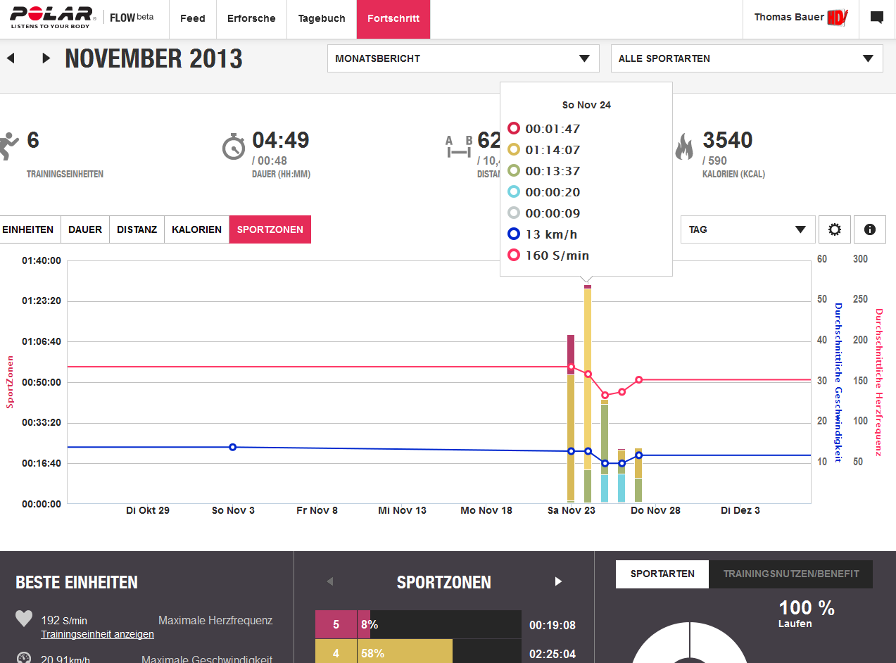 Noch umfangreicher kann die Einheit über die Internetplattform analysiert werden. Auch hier werden die Statistiken vom Smartphone, jedoch in übersichtlicher und vergrößerter Form dargestellt. Zudem wird ein Nutzen der Einheit angegeben. Bei einer langsamen Einheit wird z.B. Herz-Kreislauftraining angegeben, läuft man hingegen ein hohes Tempo mit hoher Herzfrequenz ist der Trainingsnutzen ein Tempotraining. Zudem werden übersichtlich Splitzeiten angezeigt. Splits können individuell in 0,5, 1, 2 und 5 km ausgewählt werden. In diesen wird nicht nur das Tempo berechnet, sondern auch die durchschnittliche Herzfrequenz. Ebenfalls wird zu den Einheiten ein Running Index (kostenpflichtig auf dem Smartphone) berechnet, sowie der Fettanteil an Kalorien in Prozent angegeben. Über den Menüpunkt Fortschritt lässt sich zudem der Trainingsfortschritt für einen benutzerdefinierten Zeitraum übersichtlich darstellen. Pace- und Herzfrequenzentwicklung werden in einer Grafik so dargestellt, dass sich sofort ein Trainingsfortschritt erahnen lässt (z.B. hat sich die Herzfrequenz bei gleichbleibendem Tempo reduziert?)