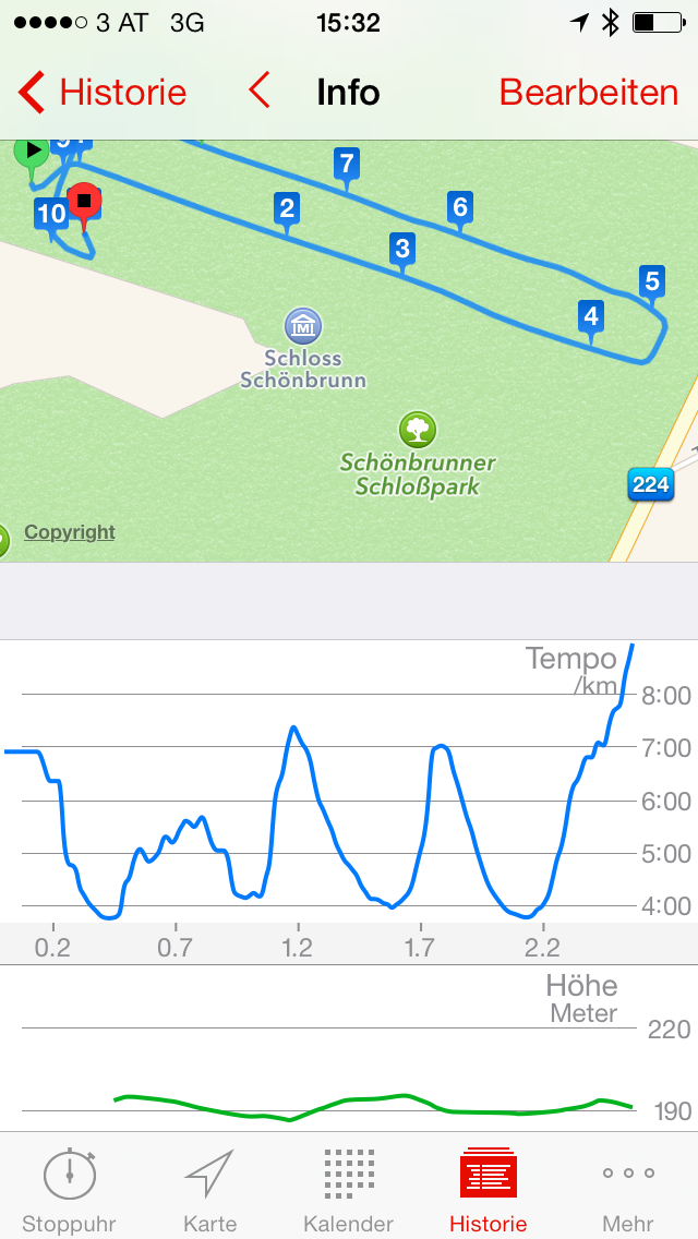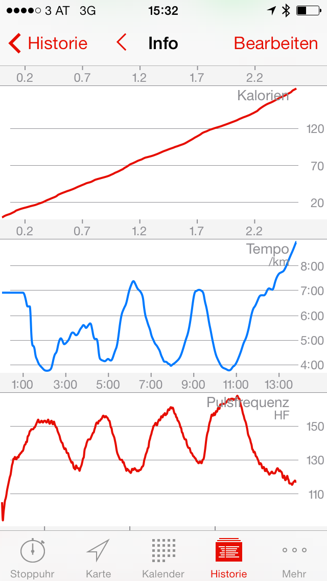 Über die Historie lassen sich Statistiken gesamt, über das Jahr, das Monat oder die Woche verteilen. In der Tagesstatistik erhält man einen kurzen Überblick zu den einzelnen Einheiten. Mit Klick auf eine Einheit, erhält man weitere Infos, dazu eine Karte die die einzelnen Kilometer und Intervalle (falls absolviert) markiert. Zudem können 30 unterschiedliche Diagramme (in den Einstellungen konfigurierbar) eingeblendet werden. U.a. wird die Tempoentwicklung, Höhenlage, der Kalorienverbrauch und Pulsfrequenzverlauf als Diagramm dargestellt. Zudem erhält man bei einem Intervalltraining die Ergebnisse aller Intervalle inkl. Herzfrequenzdaten. Weiters ist es auch möglich, die Zonen zu analysieren: Wie lange war man in der Herzfrequenzzone 2 und welches Tempo ist man gelaufen, wie lange war man in der Herzfrequenzzone 3 mit welchem Tempo. Diese Zonen können auch mit dem Lauftempo analysiert werden, wobei die Zonen im 30 Sekunden-Schnitt wechseln beginnend von 2:00 – 2:30/km. Für Läufer die viel Wert auf Trainingsanalyse legen, durchaus brauchbare Extras. Anfänger könnten diese Vielzahl an Statistiken wohl etwas überfordern.
