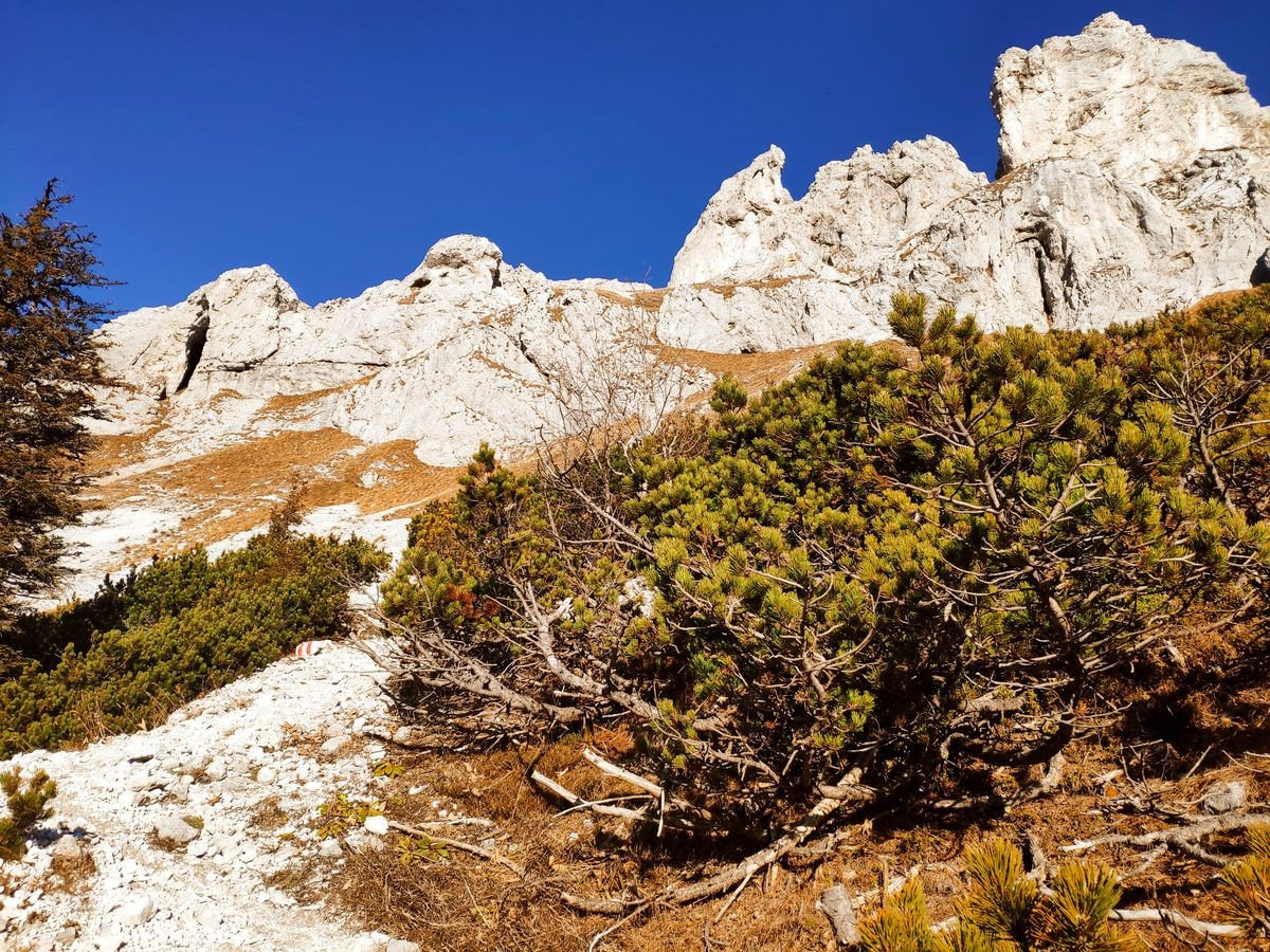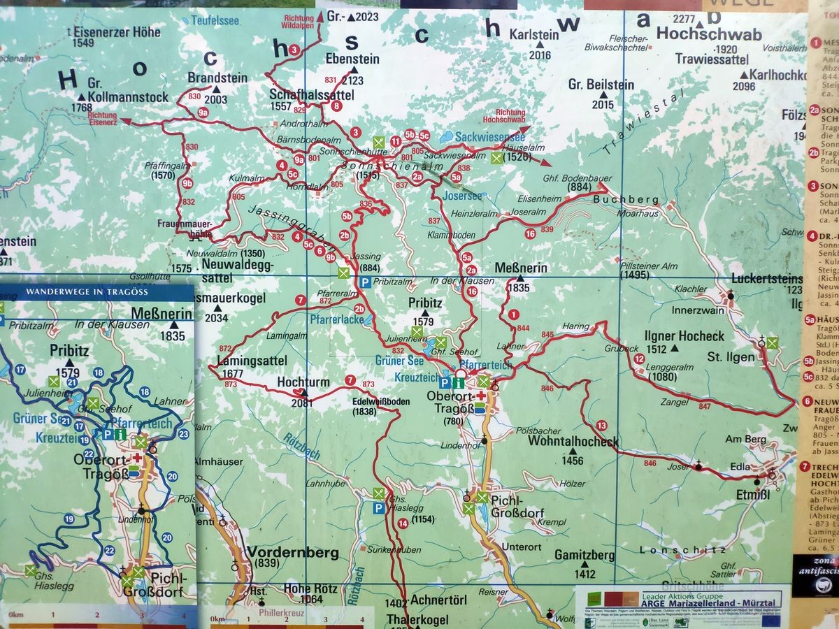 Alternative Abstiegsroute: Zuerst über den Weg 830 absteigen. Ist dann der Weg 801 Richtung Sonnschienhütte erreicht, geht es nun aber kurz in die entgegengesetzte Richtung (Eisenerz) weiter. Nach kurzer Zeit folgt nun eine Abzweigung auf Weg 830/832 Richtung Pfaffingalm und Frauenmauerhöhle. Den Weg 832 weiter zum Jassinggraben folgen und abschließend an der Forststraße weiter bis zum Parkplatz. Distanz in etwa gleich lang wie die normale Aufstiegsroute. (siehe dazu auch in den Bildern die Karte mit den Wegen).