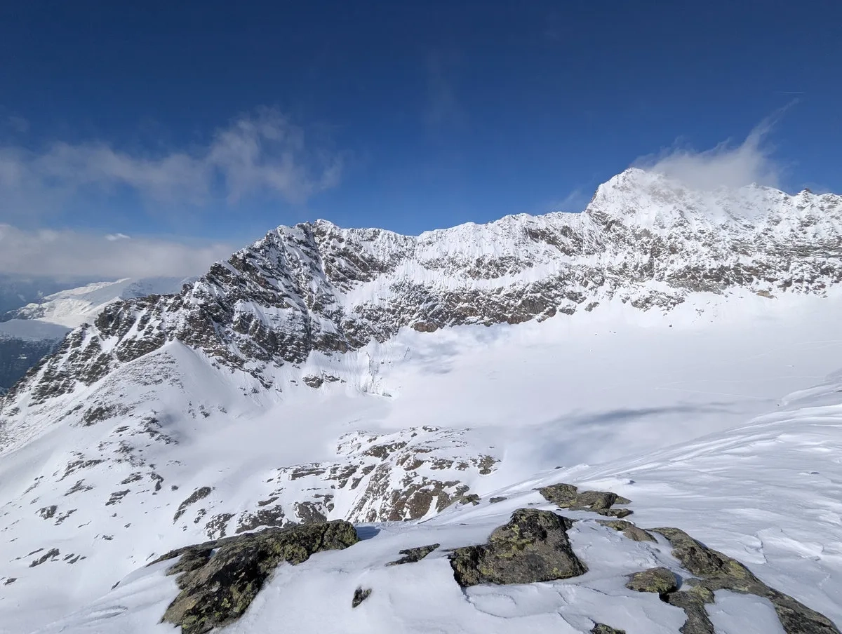 - Vom Gipfel führt ein kurzes Stück entlang des Aufstiegs zurück, ehe man nach links zu einer Scharte auf etwa 3.200 Metern Höhe quert.