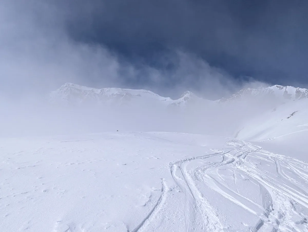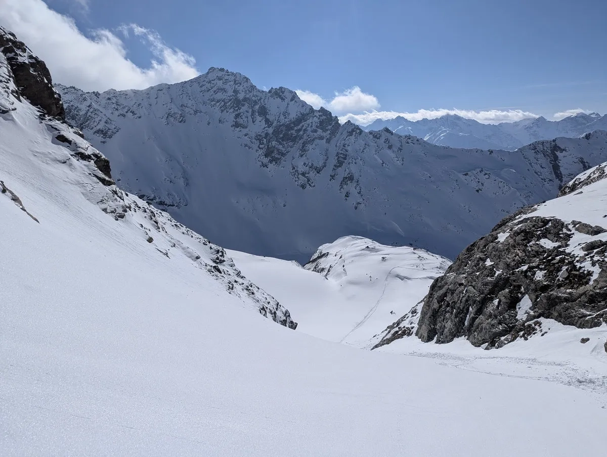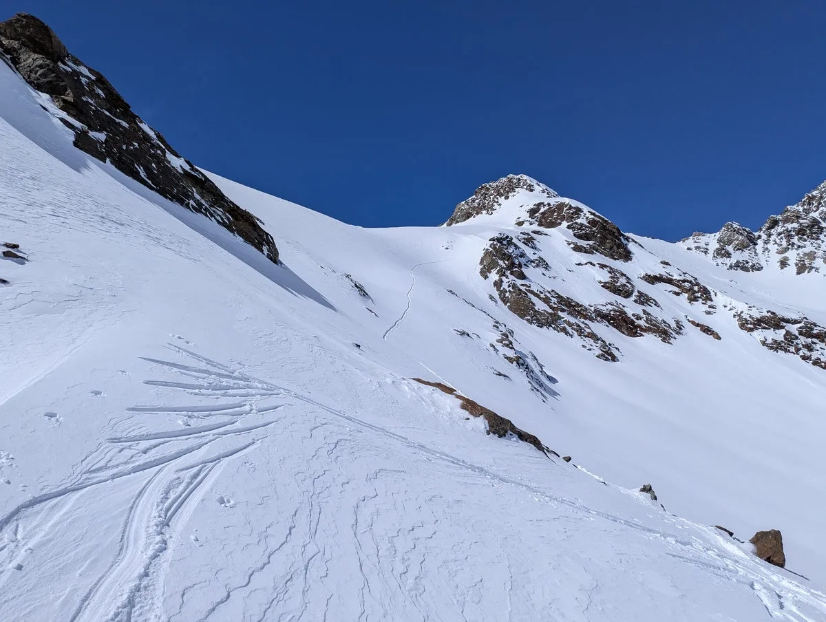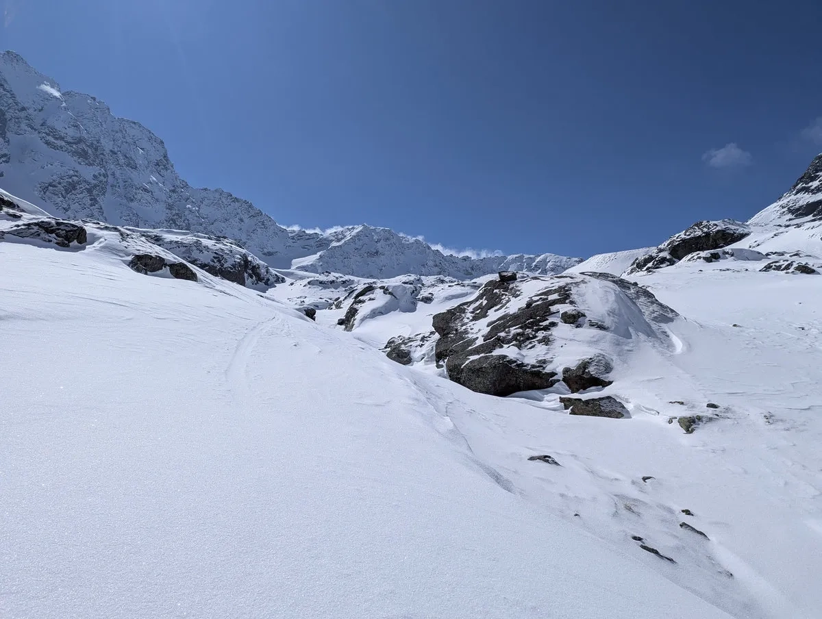 - Dort gleitet man rund 200 Höhenmeter sanft bergab und passiert links einen Eisbruch. Anschließend scharf nach links in eine breite Rinne und weiter Richtung Westen, ehe man rechts vom Grasstallsee den Blick ins Grastal öffnet. Ab hier meist logisch und hoffentlich elegant ins Tal abfahren.