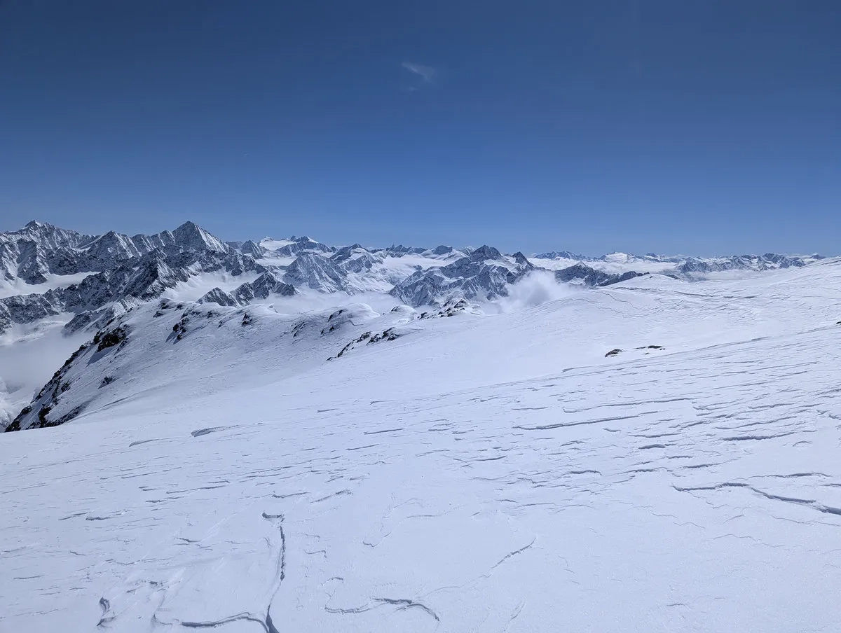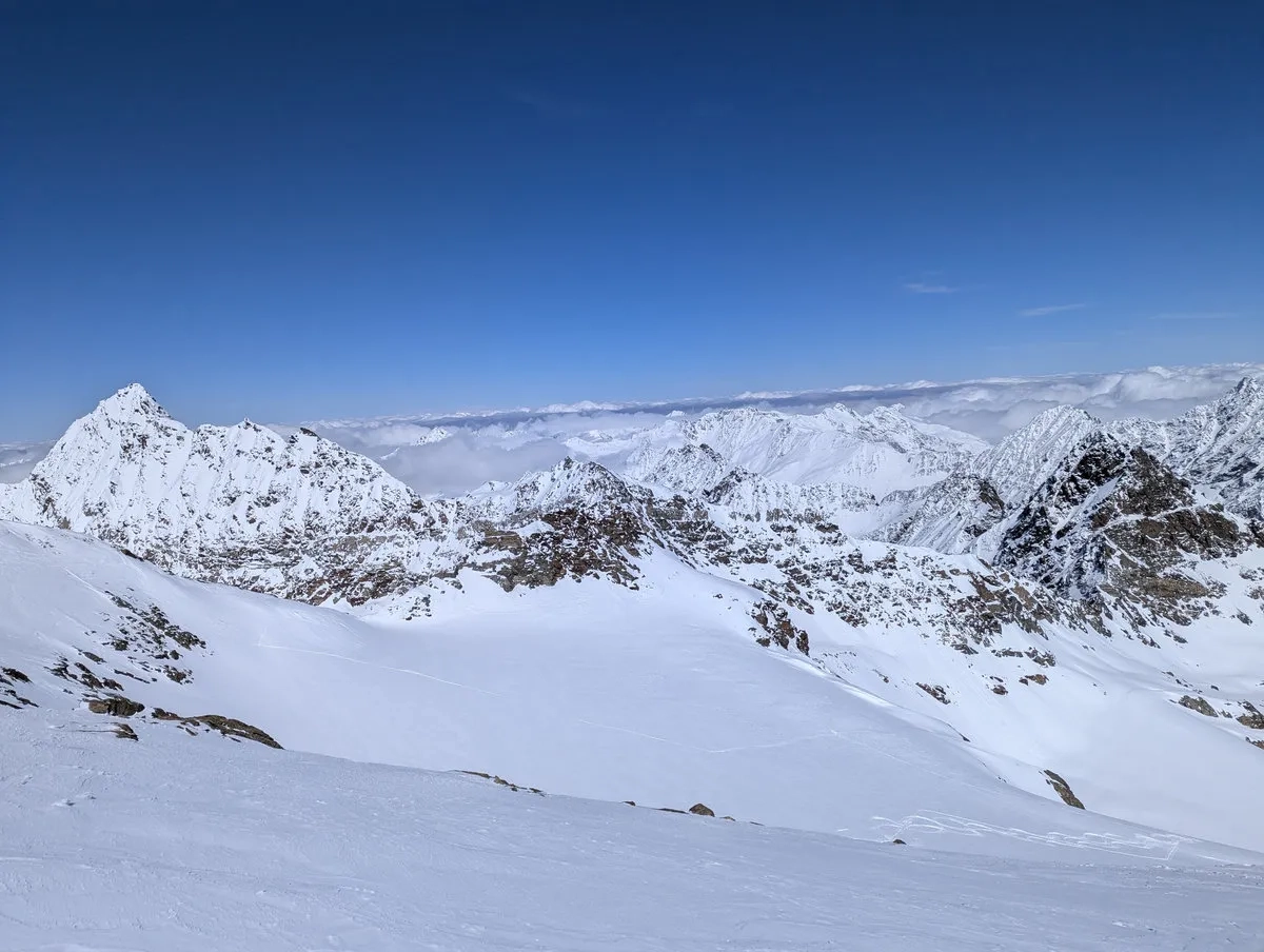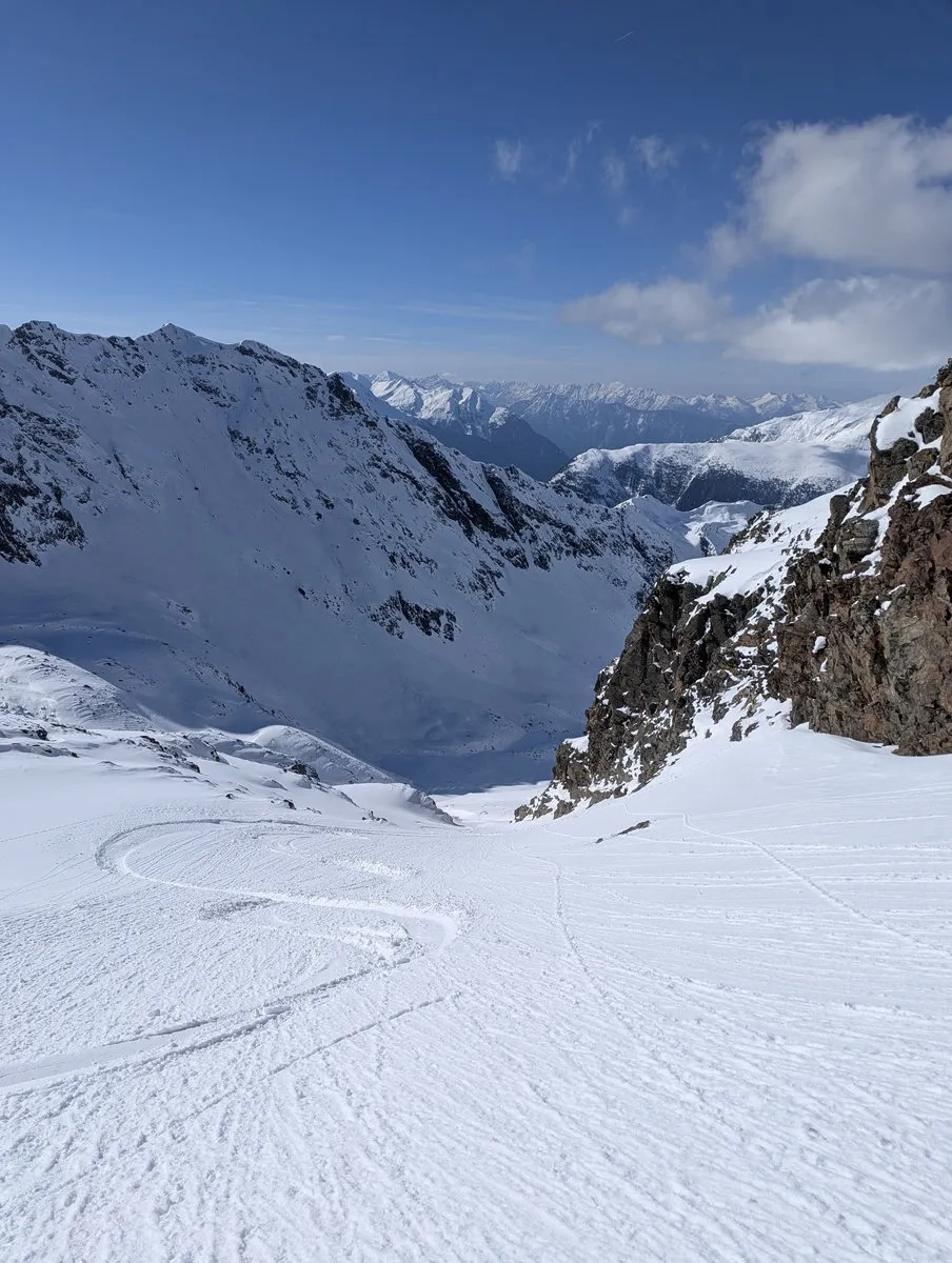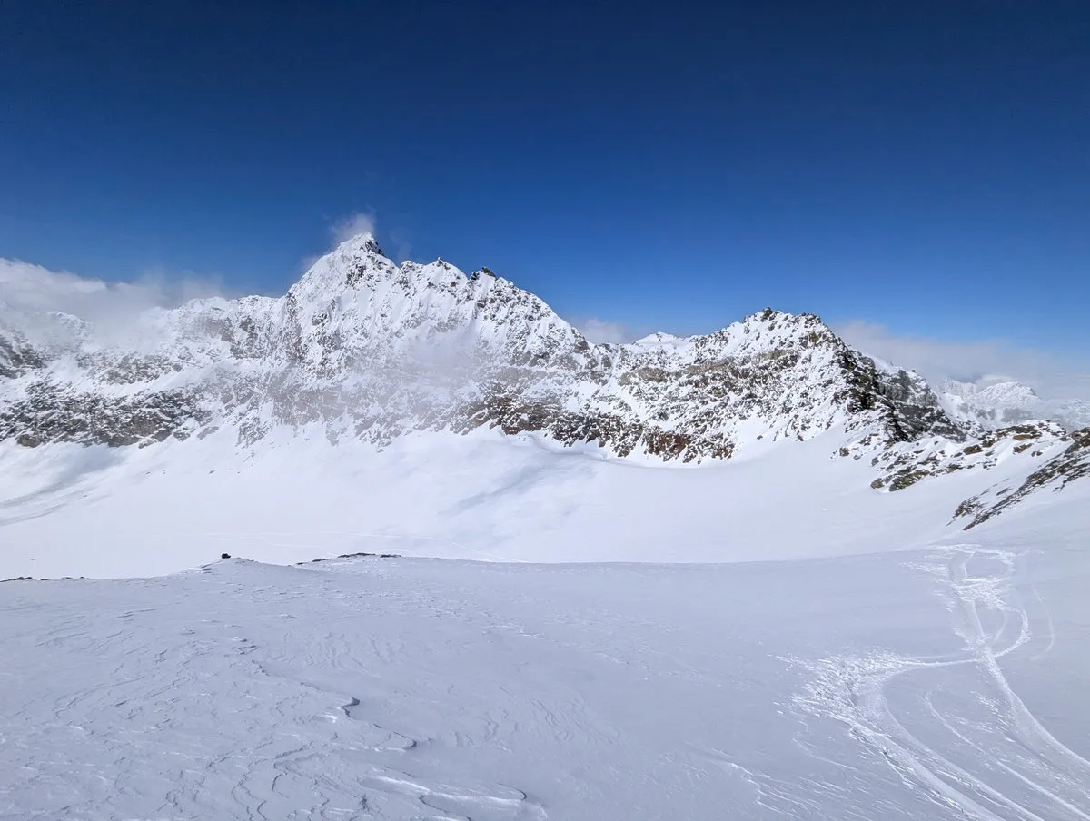 Nach fast 15 Kilometern Aufstieg und über 1.700 Höhenmetern folgt die verdiente Belohnung: eine lange, abwechslungsreiche Abfahrt über den Grasstallferner und das Grastal. Kurz unterhalb des Gipfels führt eine Scharte auf den weitläufigen, flachen Gletscher, über den man die nächsten zehn Kilometer Richtung Niederthai gleitet.