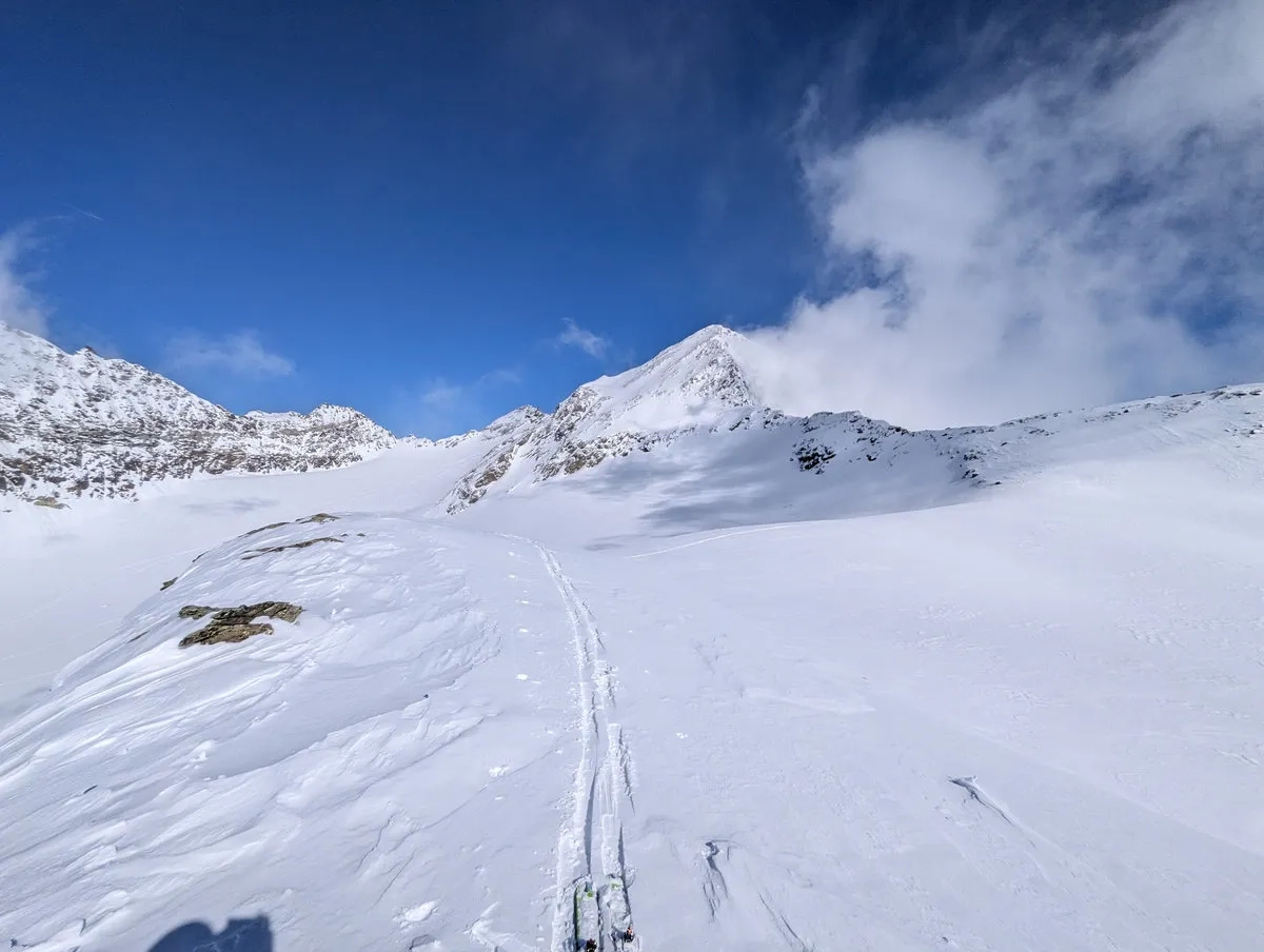 - Erst nach rund 12 km auf etwa 2.700 Metern Höhe folgt eine Steilstufe zum Zwieselbachjoch auf 2.868 Metern Höhe. Die letzten Meter können je nach Bedingungen Tragepassagen erfordern. Ja, genau dieser Moment, wo Ski plötzlich erstaunlich schwer werden.