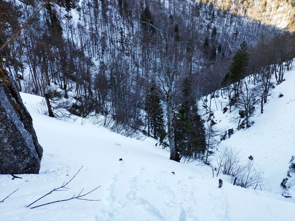 Im Aufstiegsweg ist nur der Schlussabschnitt markiert. Ansonsten nicht markierter Weg im Aufstiegs. Die Abstiegsroute ist markiert.