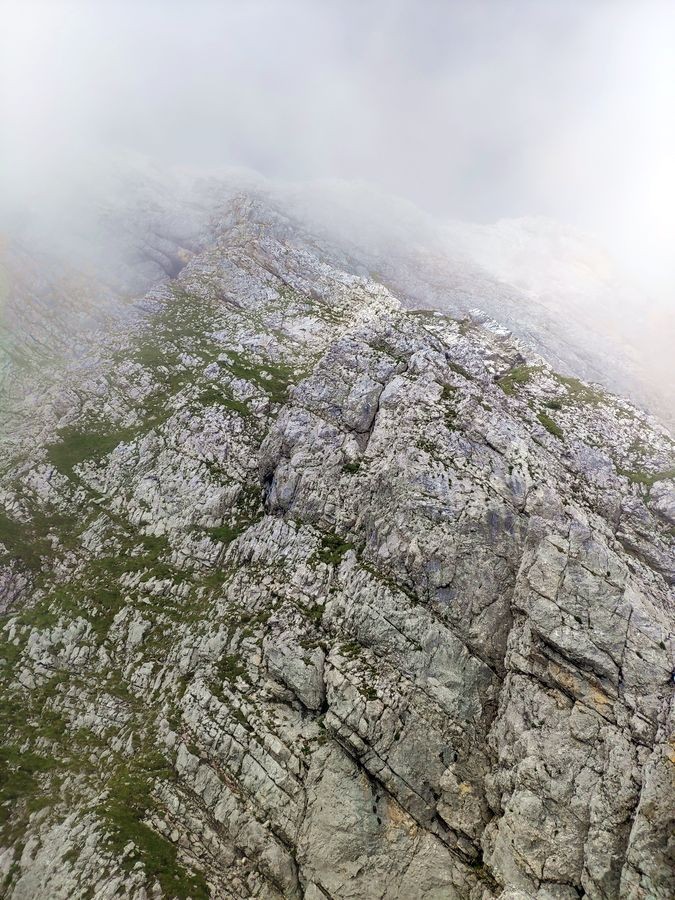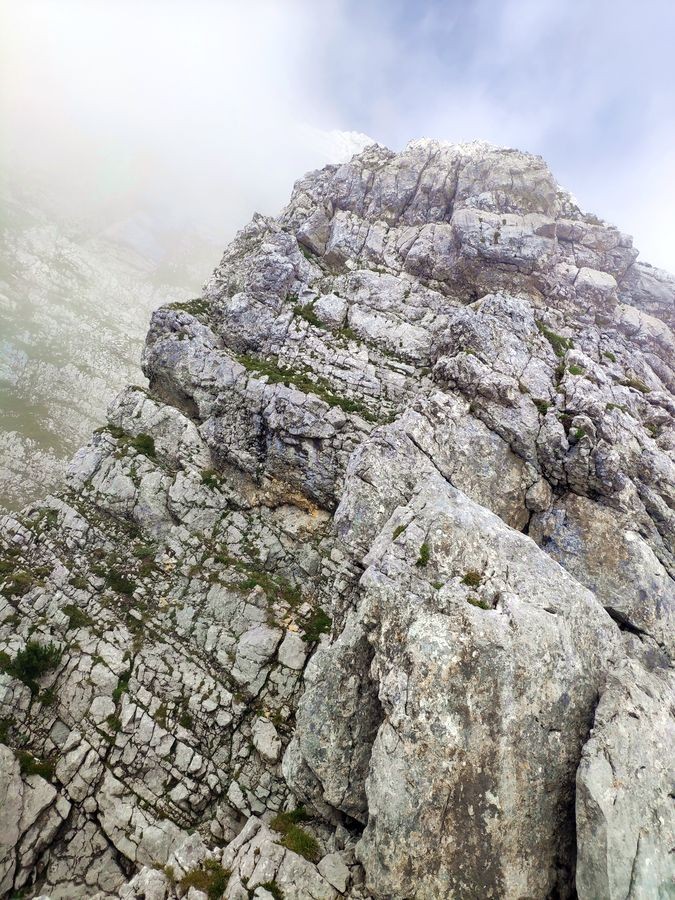 Völlig ausgesetzter Grat ohne Markierungen, Bohrhaken und Steigspuren - keine künstlichen Sicherungsmöglichkeiten vorhanden. Schwierigkeiten meist UIAA II, aber auch Stellen mit III - etwas schwieriger als der durchgehend markierte Südostgrat. Nur bei stabiler Wetterlage und guter Sicht zu empfehlen.