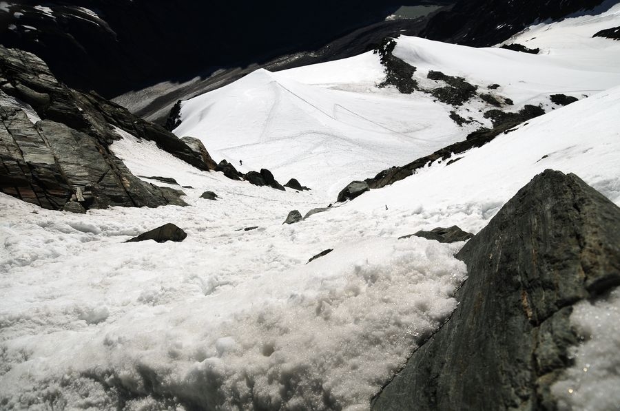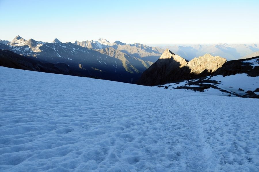 Blick zurück. Der Weg ist immer gut zu sehen. Von Gletscherspalten ist nichts zu sehen.