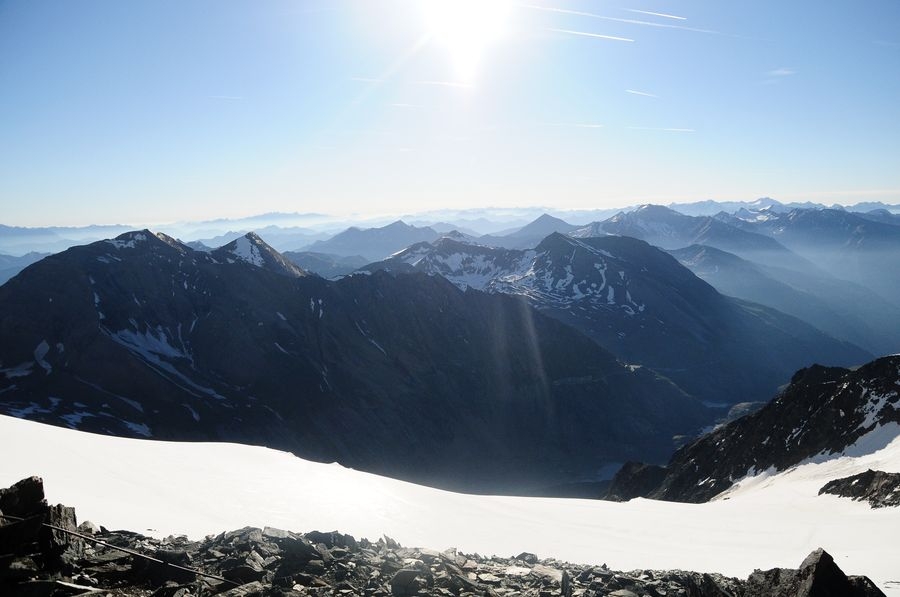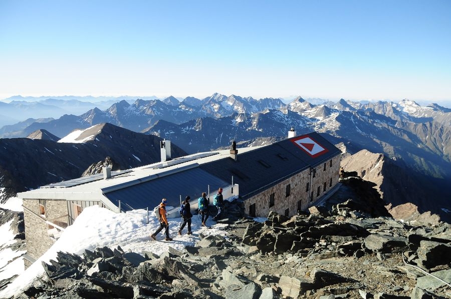 Auf 3.454 Metern Höhe bei der Erzherzog-Johann-Hütte. Die ersten Wanderer sind bereits auf dem Retourweg (ich nehme mal an, sie gingen heute aber von der Hütte los).