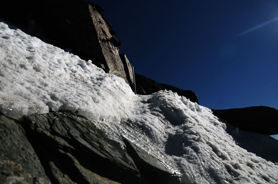 So, nun ist endgültig das Steigeisen notwendig. Vereiste Felsen.