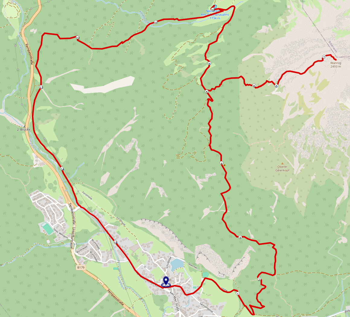 - Richtung Wanderparkplatz und Tennisplatz gehen und dort auf einer Forststraße den Beschilderungen Richtung Wannig und Nassereither Alm folgen.