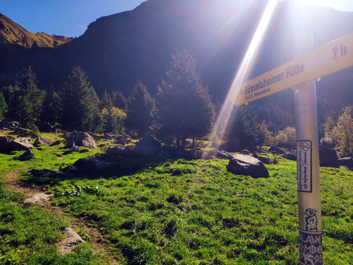 - Über die Straße gehen und ein paar Meter weiter Richtung Plangeroß, bis eine Beschilderung den Wanderweg zur Rüsselsheimer Hütte zeigt.