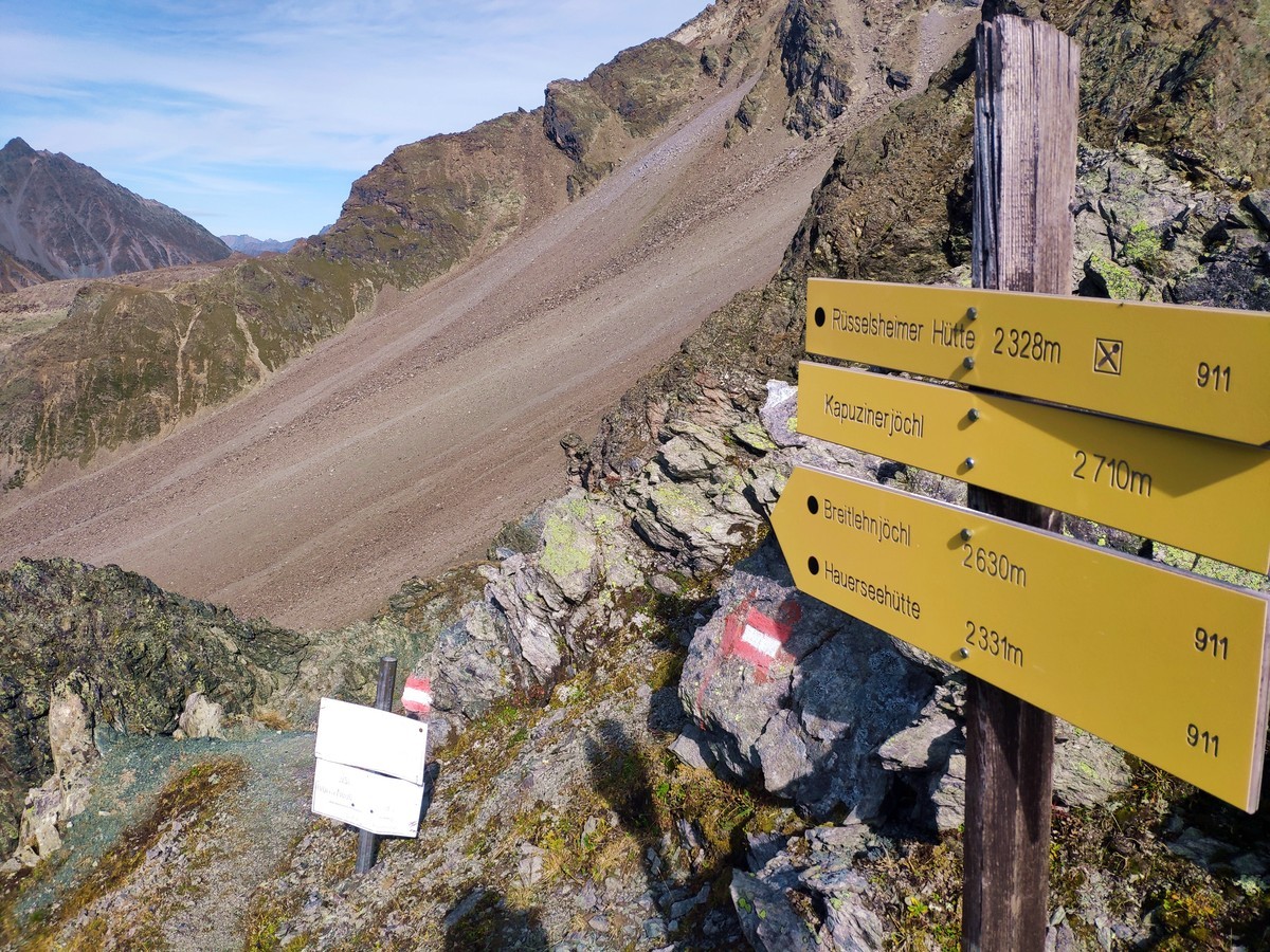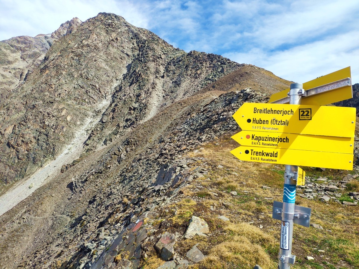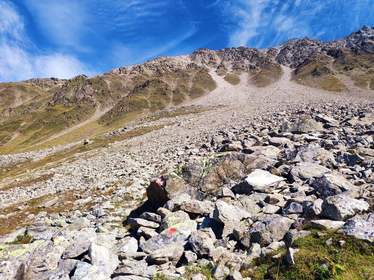 - Einige Zeit nach dem Rötkarljoch befindet sich auf etwa 2.480 Metern eine Abzweigung, welche in das Tal nach Trenkwald führt.