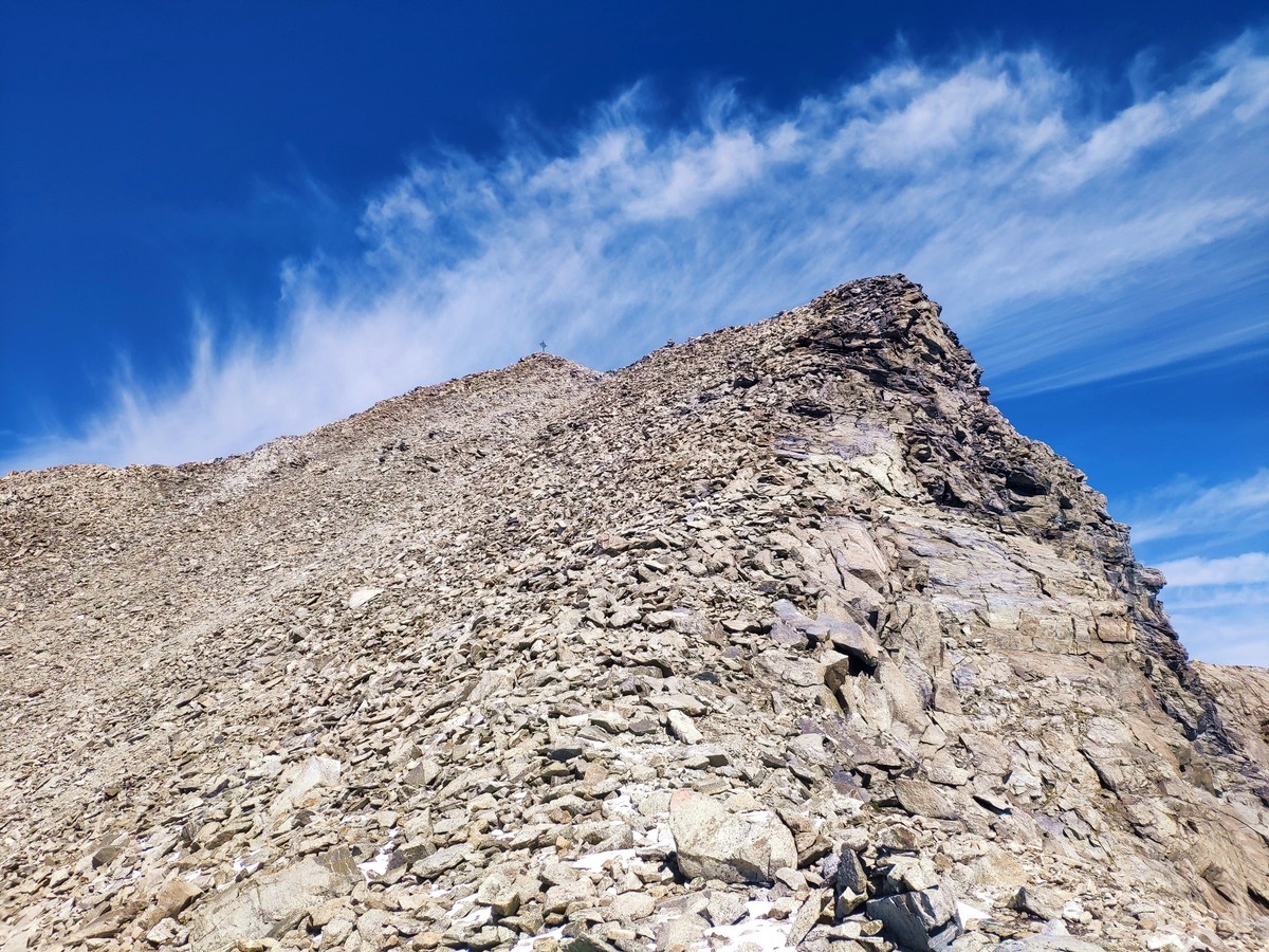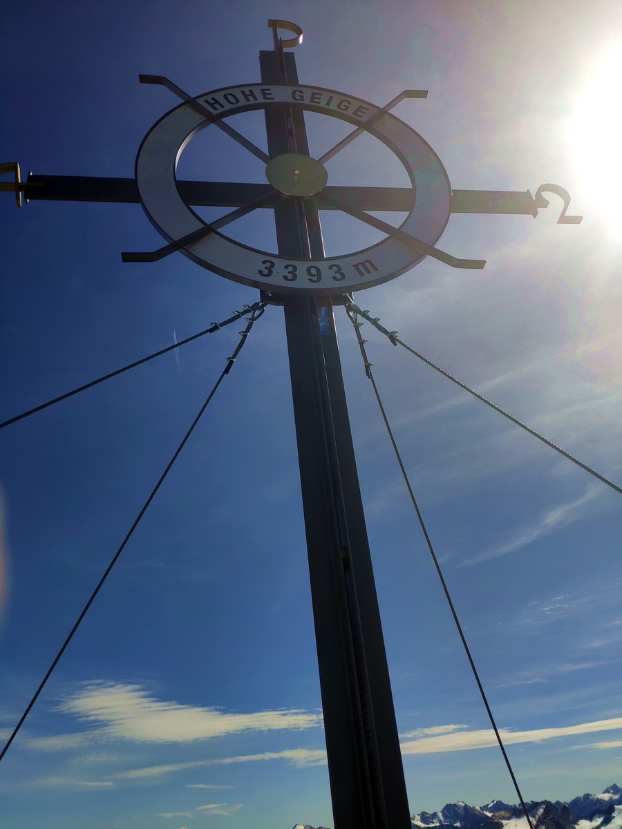 - Vom Westgrat sind es nun mehr als zwei Kilometer bis zum Gipfel der Hohen Geige. Der Schlussabschnitt nach dem Westgrat (alter Normalweg trifft mit dem Westgrat aufeinander) wird zuerst rechts gegangen und dann links über einen Grat mit einfachem Blockgelände auf den Gipfel gestiegen.