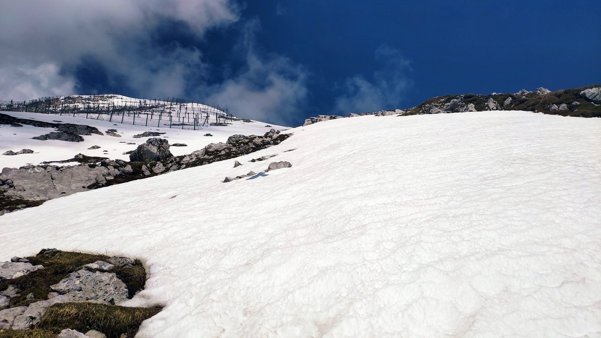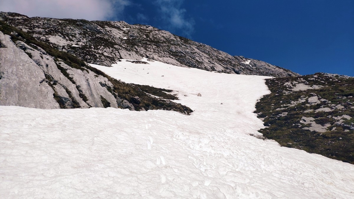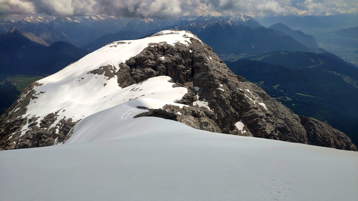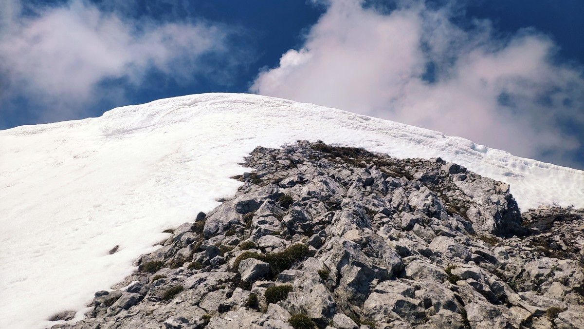Der Übergang vom Ostgipfel zum Westgipfel kann im Frühsommer durch den Altschnee deutlich erschwert werden.