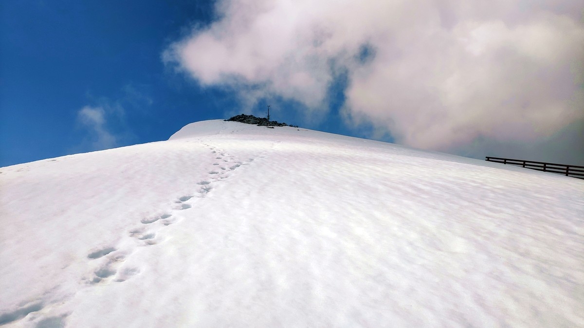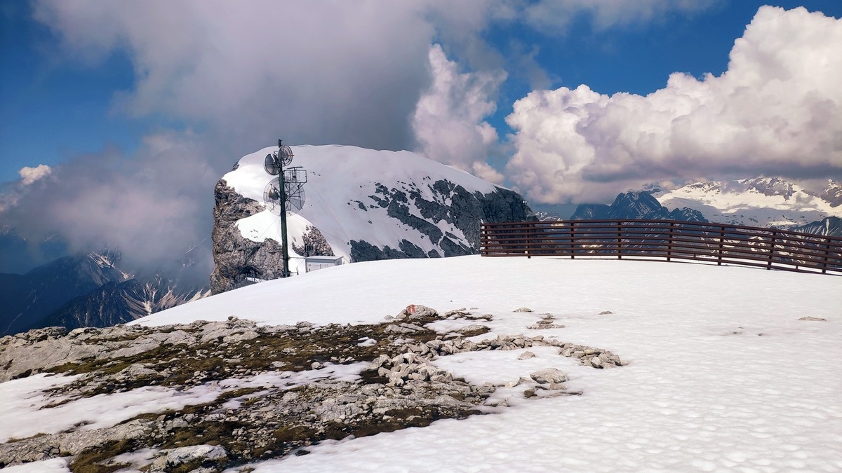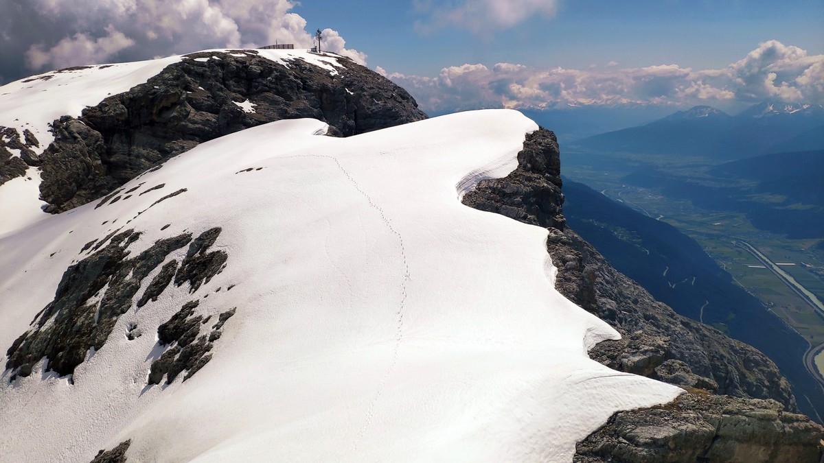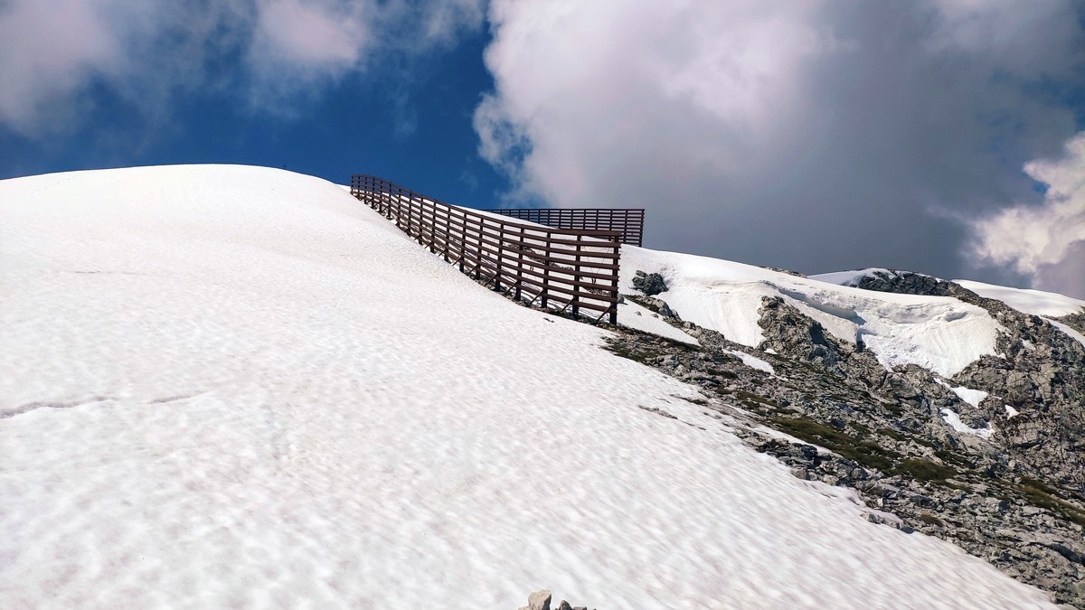 Der Übergang vom Ostgipfel zum Westgipfel kann im Frühsommer durch den Altschnee deutlich erschwert werden.