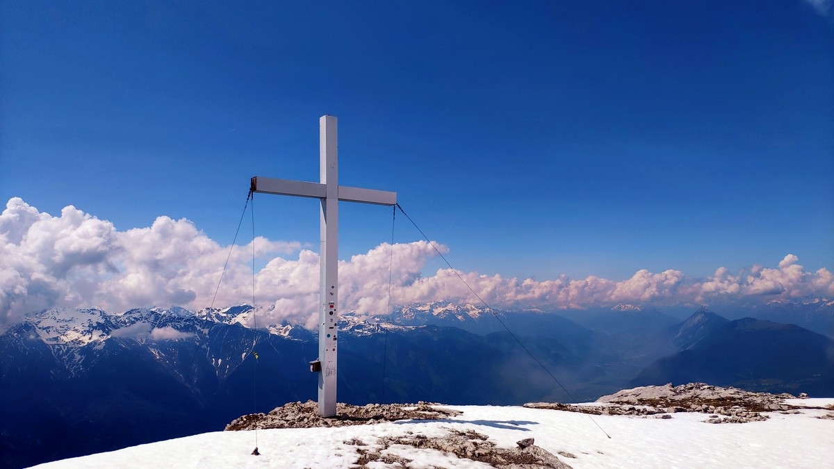 - Wer nun noch genug Energie hat, kann auf einem knapp ein Kilometer langen Weg über das Gipfelplateau den 2.662 Meter hohen Hohe Mute Westgipfel erreichen. Das Gipfelkreuz ist bei guter Sicht sogar direkt vom Ostgipfel aus zu sehen. Gehzeit ca. 30 Minuten zwischen den Gipfeln.