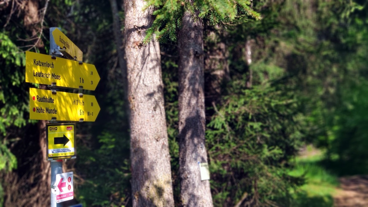 - Nach etwa einem Kilometer steil bergab auf dieser Forststraße rechts auf einen Wanderweg abzweigen und diesem nach Moos zum großen "Wanderparkplatz Munde" weiter.