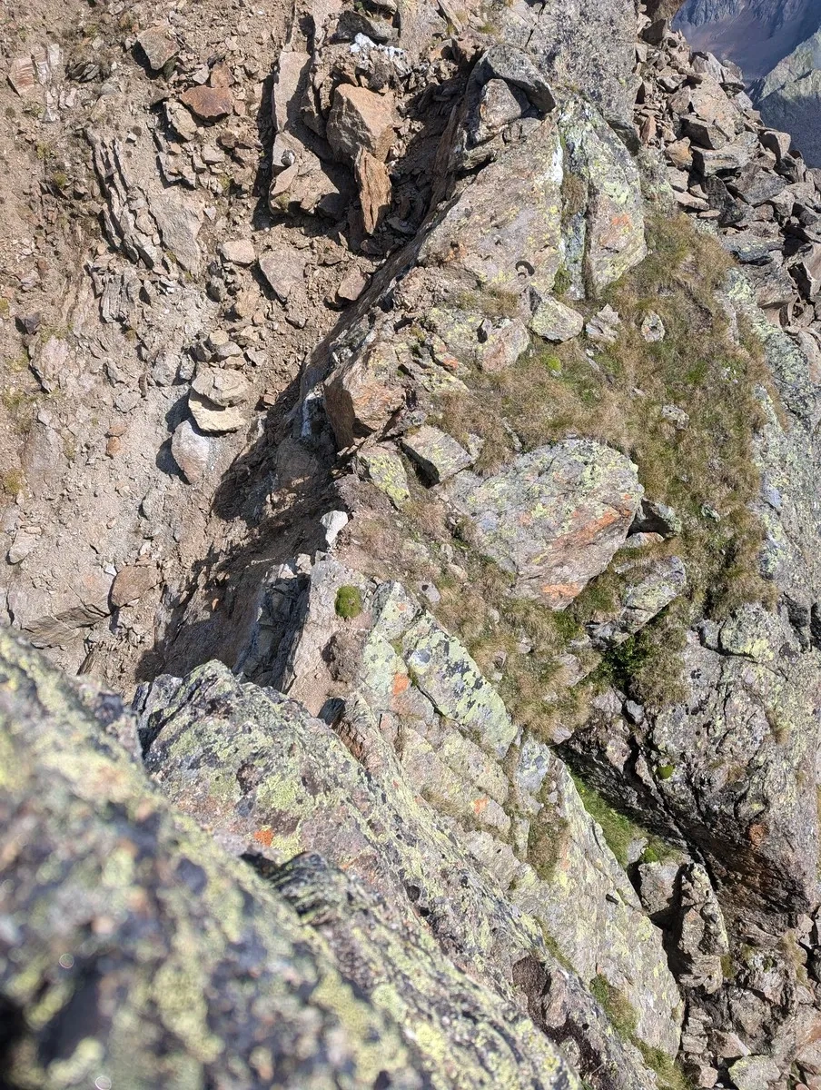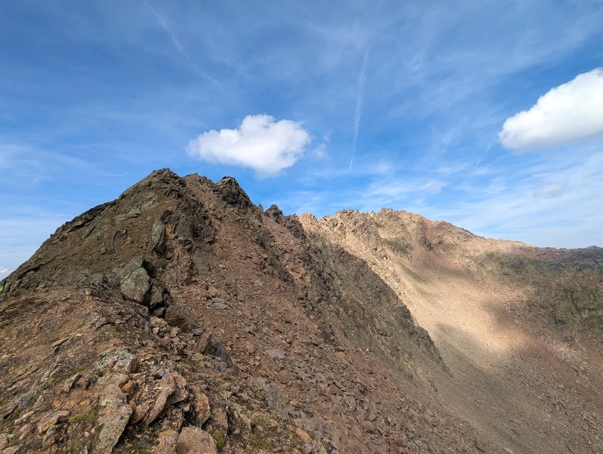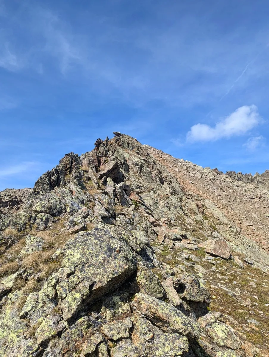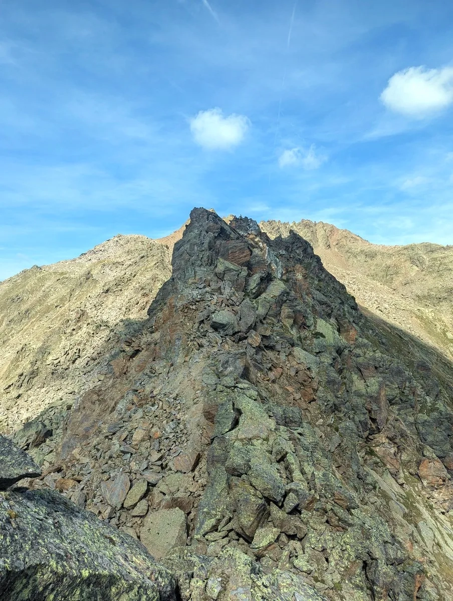 - Auf ca. 2.800 Metern Höhe kann ein erster Gratabschnitt westseitig im Blockgelände umgangen werden. Der Grat ist jedoch in der Regel gut begehbar.