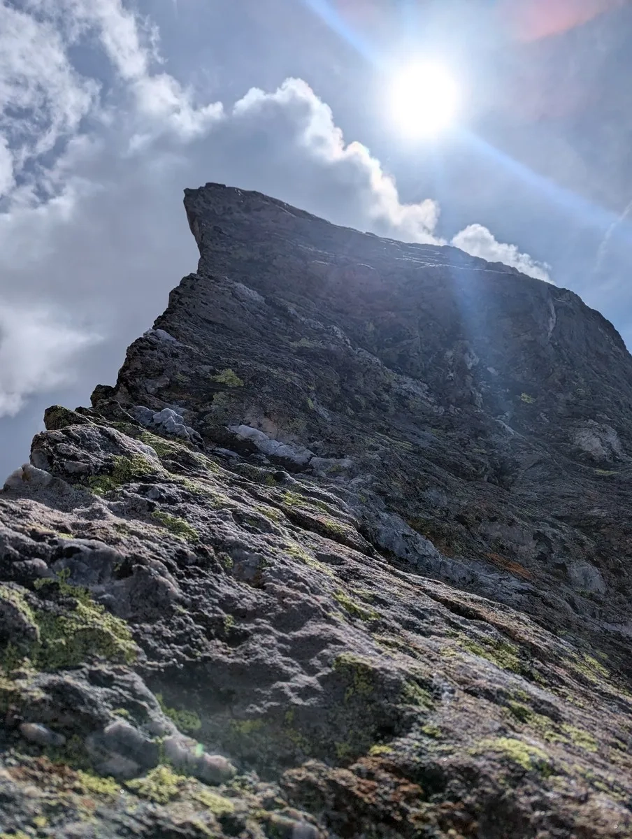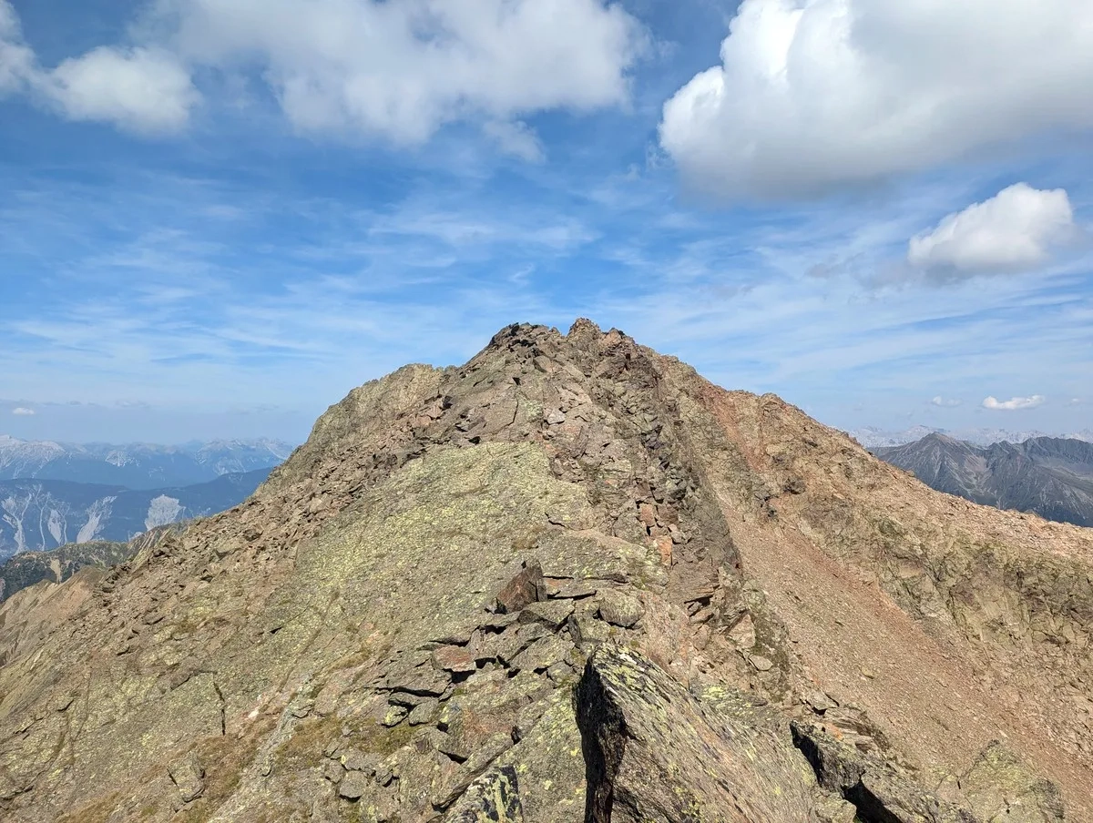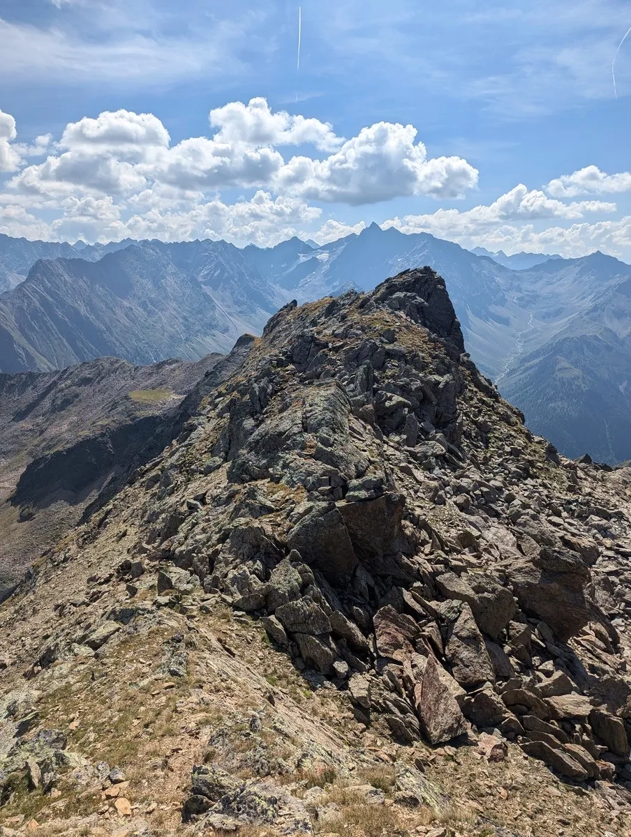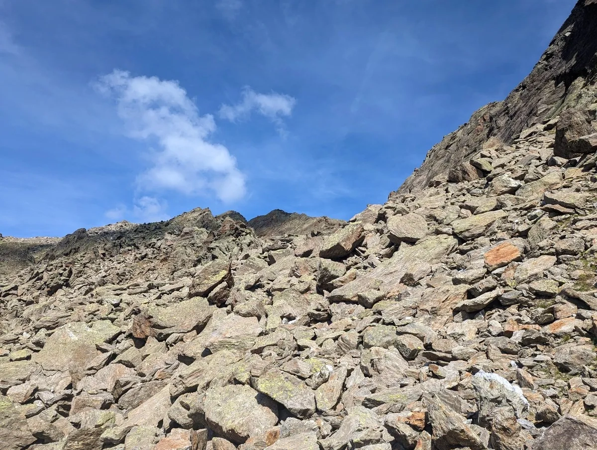 - Auf ca. 2.800 Metern Höhe kann ein erster Gratabschnitt westseitig im Blockgelände umgangen werden. Der Grat ist jedoch in der Regel gut begehbar.