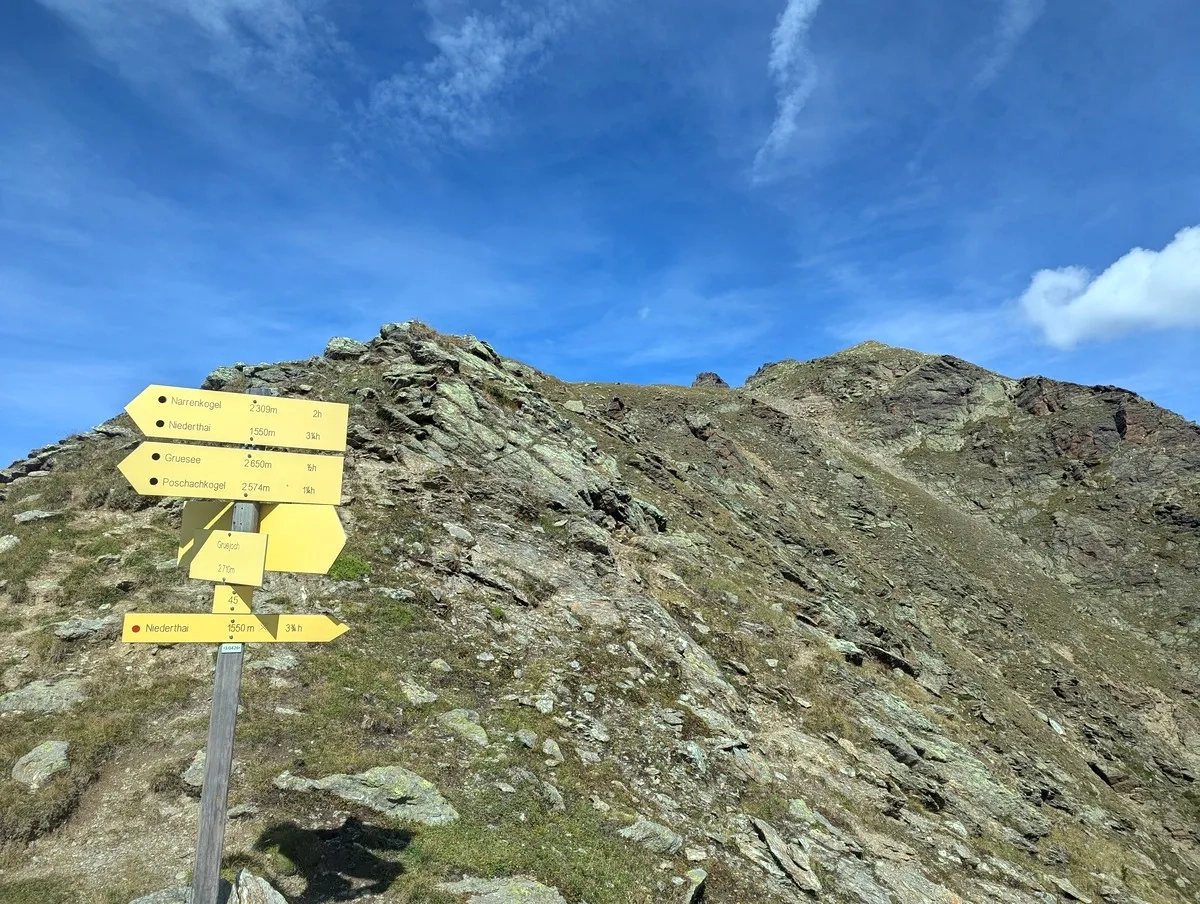 - Vom Poschachkogel etwa 100 Höhenmeter absteigen und der Beschilderung zum Gruesee folgen.