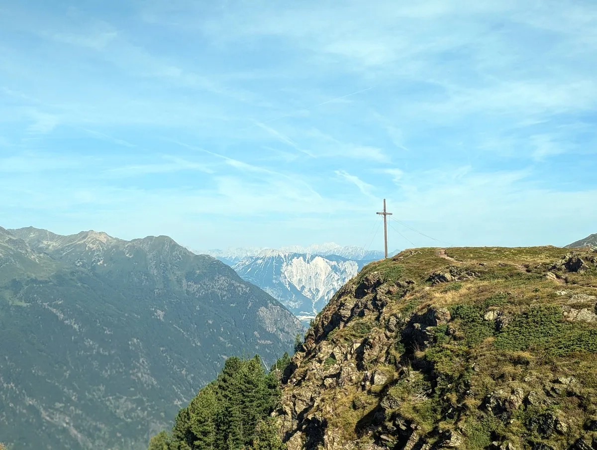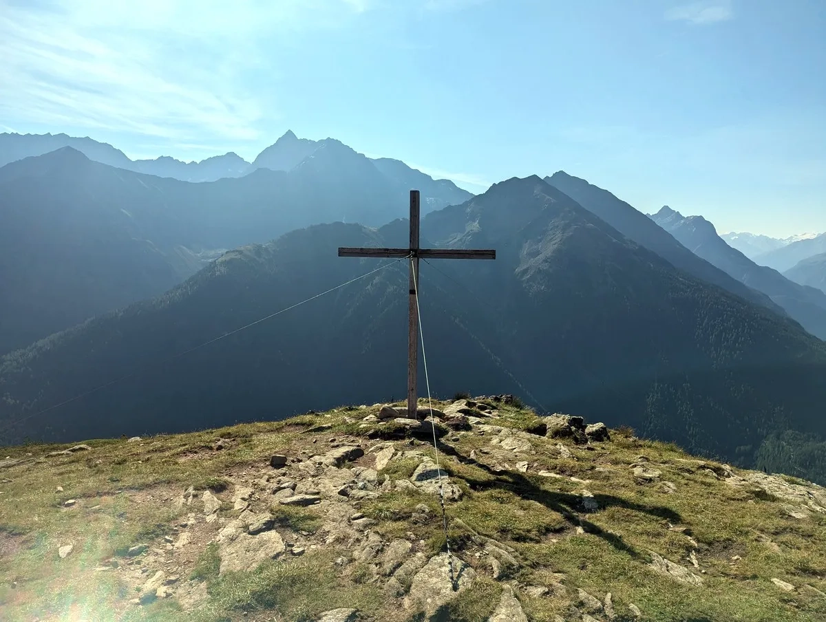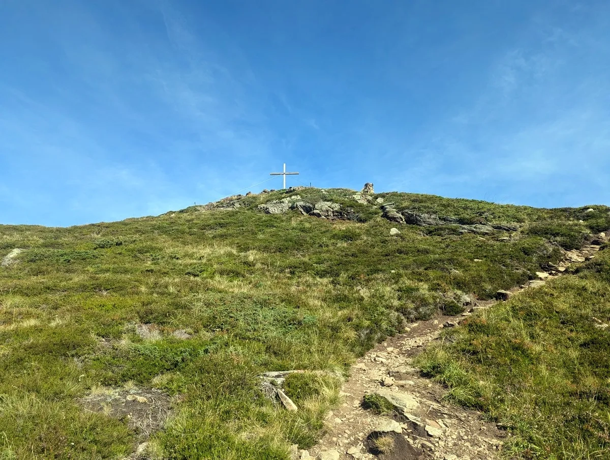 - Vom Poschachkogel aus ist bereits das Gipfelkreuz des Gruegrat im Norden zu sehen. Ein unmarkierter Pfad führt dorthin. Nach dem Gipfel wieder zurück zum Poschachkogel.