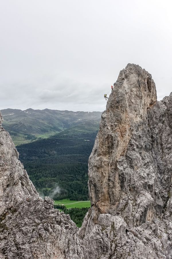Seit kurzem führt neben dem Normalweg ein knackiger Klettersteig auf den Arzalpenturm. Die neue Via Ferrata, die Bepi Martini und dem legendären Sextner Bergführer und Tourismuspionier Much Happacher gewidmet ist, hat alle Voraussetzungen, um ein Dolomiten-Klassiker zu werden. Doch bevor das Klettersteig-Vergnügen beginnt, heißt es erst einmal ab zum Einstieg. Knapp eineinhalb Stunden ist man auf dieser geschichtsträchtigen Strecke vom Kreuzbergpass aus unterwegs, ehe der Einstieg in einer kleinen Schuttrinne erreicht ist. „Der erste Teil der Via Ferrata, für die eine Klettersteigausrüstung unabdingbar ist, beginnt im Schwierigkeitsgrad C. Auch danach bleibt der gesicherte Kletterweg anspruchsvoll (C/D) und geht erst im zweiten Drittel in einfacheres Gelände über“, erklärt Christian Sordo. Der Bergführer und Leiter der Alpinschule Sexten Drei Zinnen empfiehlt den Gipfel des Arzalpenturms im Uhrzeigersinn zu besteigen.
