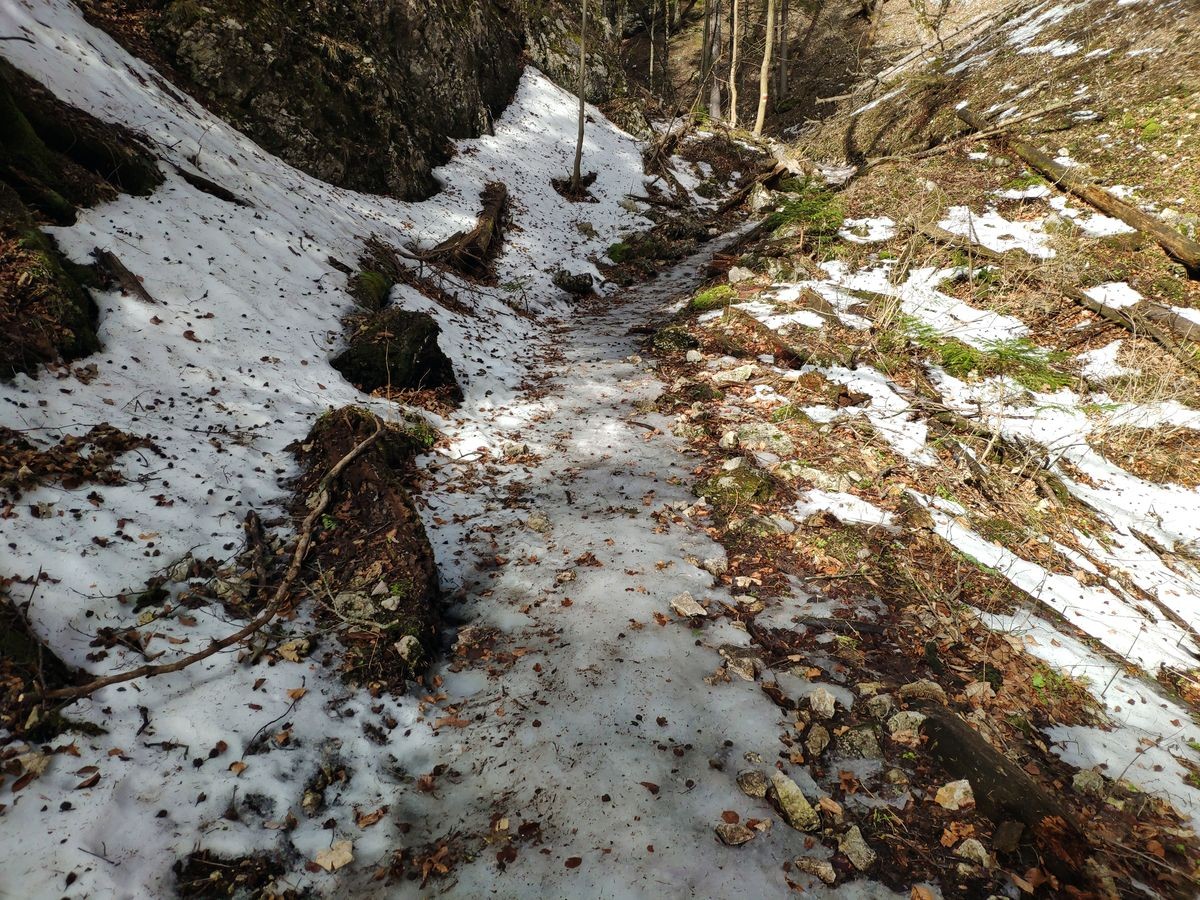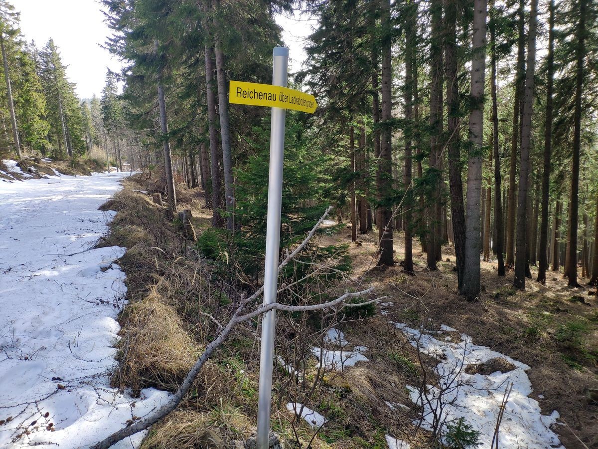 Payerbach Schneedörf (550 m Höhe) - markierten Weg zum Naturfreundehaus Knofeleben folgen - Mariensteig - durch die Schlucht und den Wald den gelben Markierungen Richtung Konfeleben folgen - Naturfreundehaus Knofeleben (1.250 m) - links am Haus vorbei dem markierten Weg folgen zuerst durch den Wald, dann teilweise auf Felsen zum Gipfelkreuz - Gipfel Knofeleben