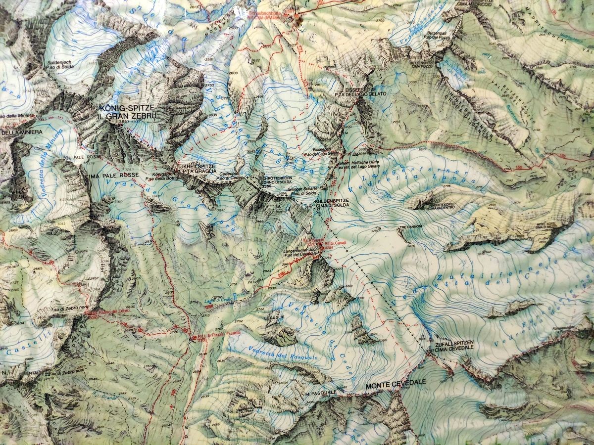 Sulden Talstation Seilbahn - Schaubachhütte - anfangs dem markierten Weg Richtung Cevedale / Casatihütte folgen - Gletscher (Suldener Ferner) - Suldenspitze - Abstieg zur Casati Hütte - Gletscher - Monte Cevedale - Zufallspitze - Abstieg wie Aufstieg - kurz vor der Casatihütte lohnt sich eine Abstecher nach rechts zu "Tre Cannoni" (siehe Bilder)