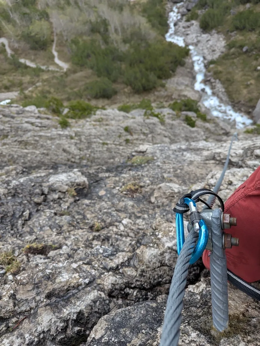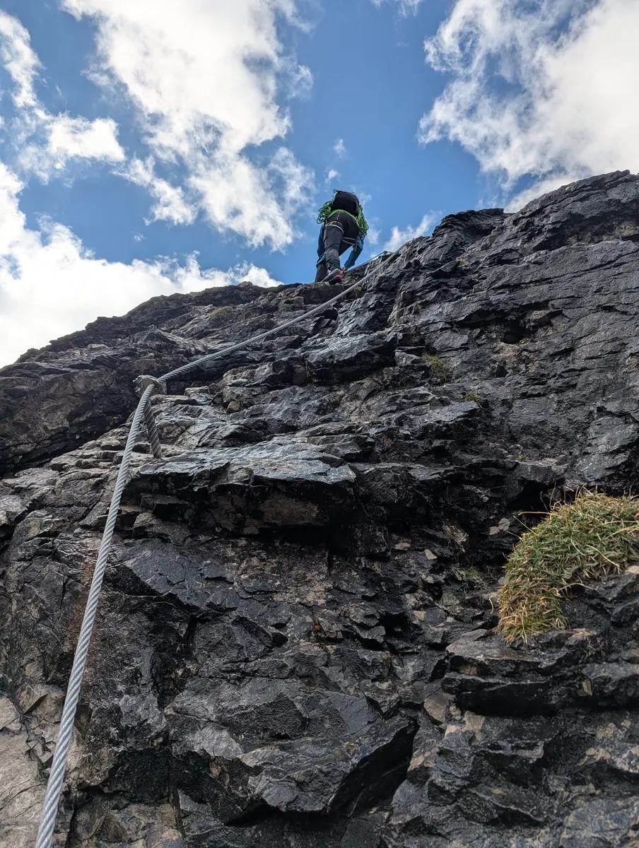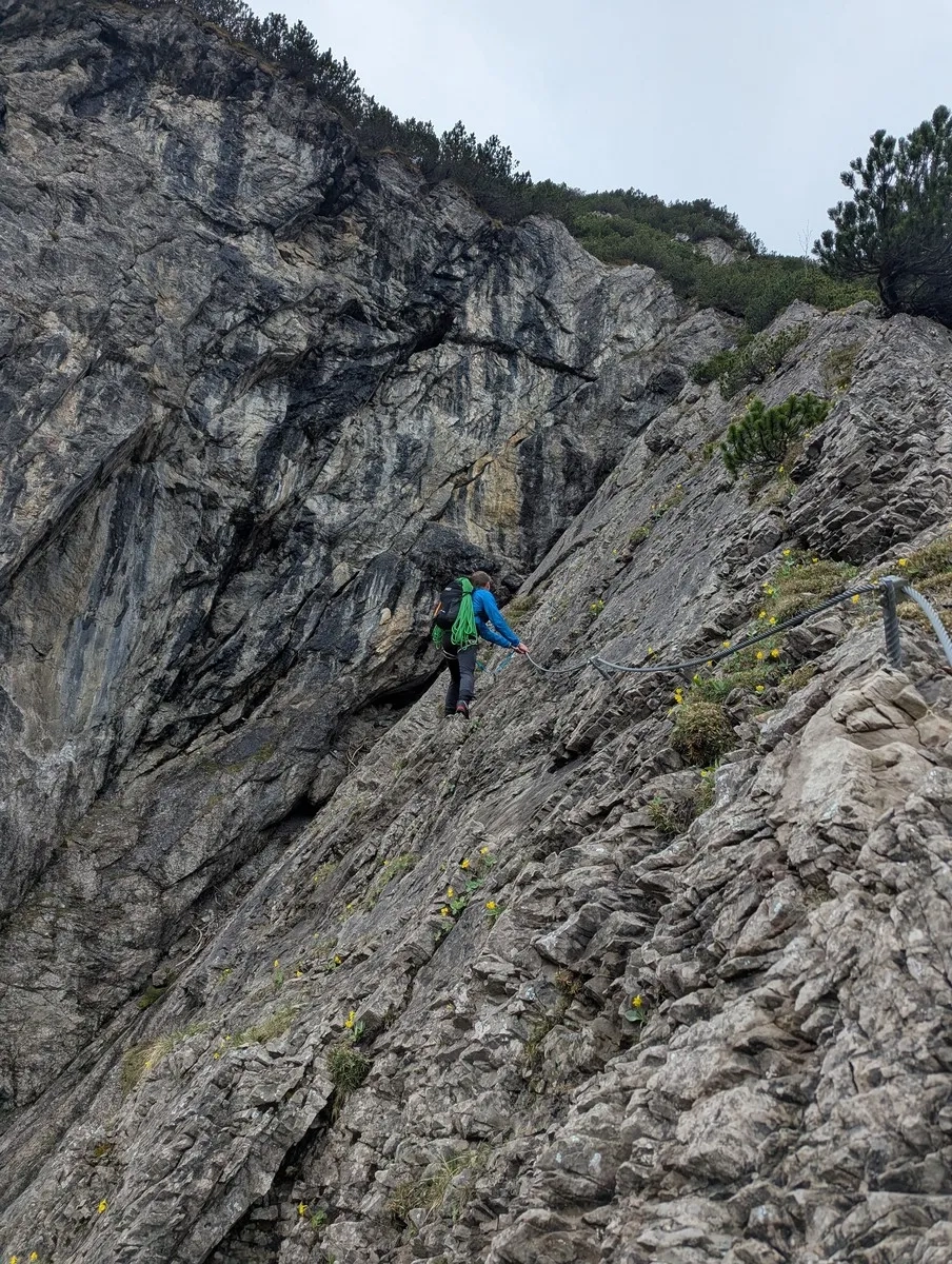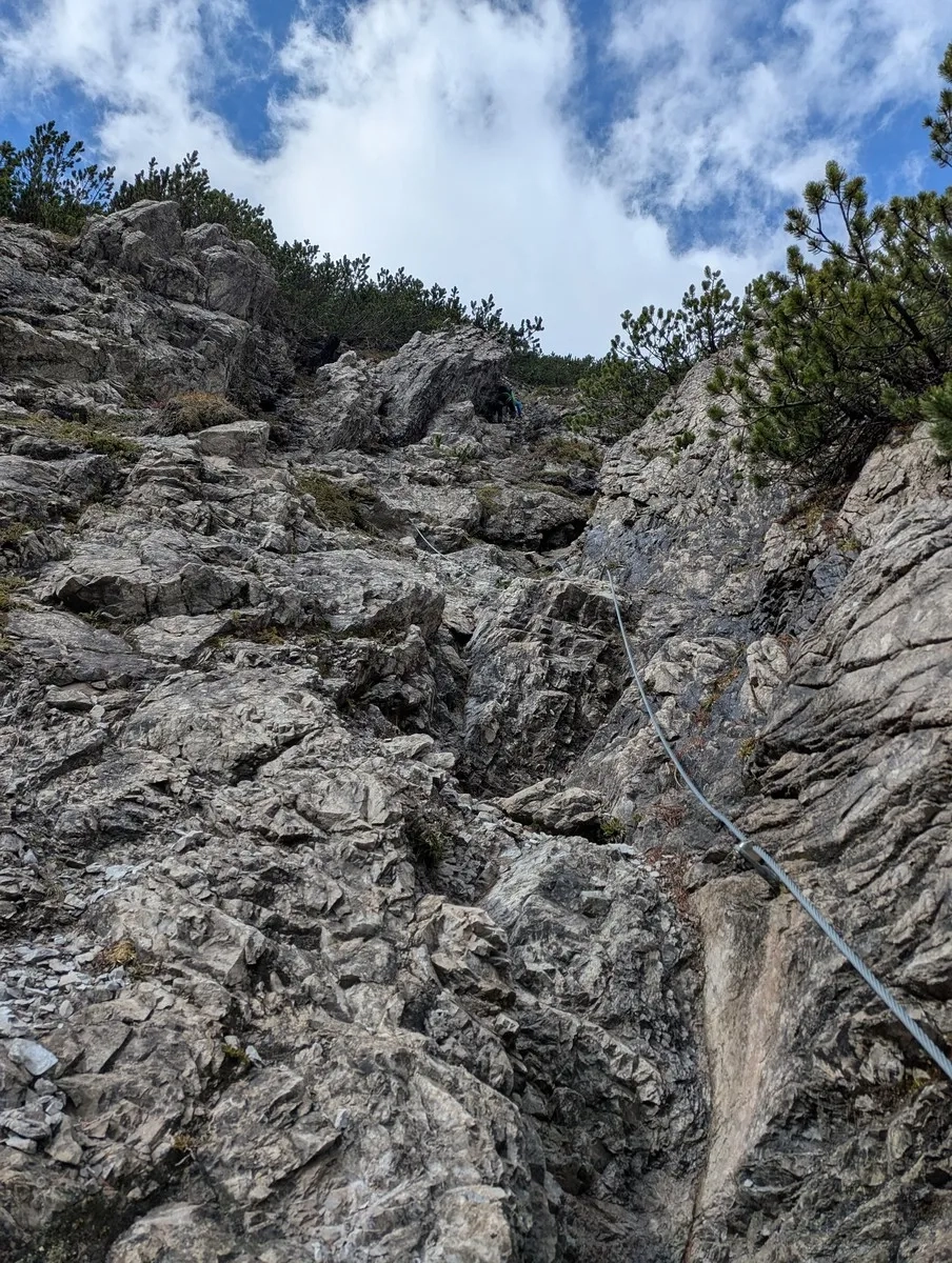 - Etwa auf halber Strecke kann man die Hauptroute verlassen und über einen Klettersteig aufsteigen. Zwei Varianten stehen zur Wahl: Eine B/C-Variante (ideal zum Aufwärmen) oder die sportlichere D-Route mit luftiger Seilbrücke. Der Grat ruft – aber erst mal bitte die Klettersteig-Taufe überstehen.