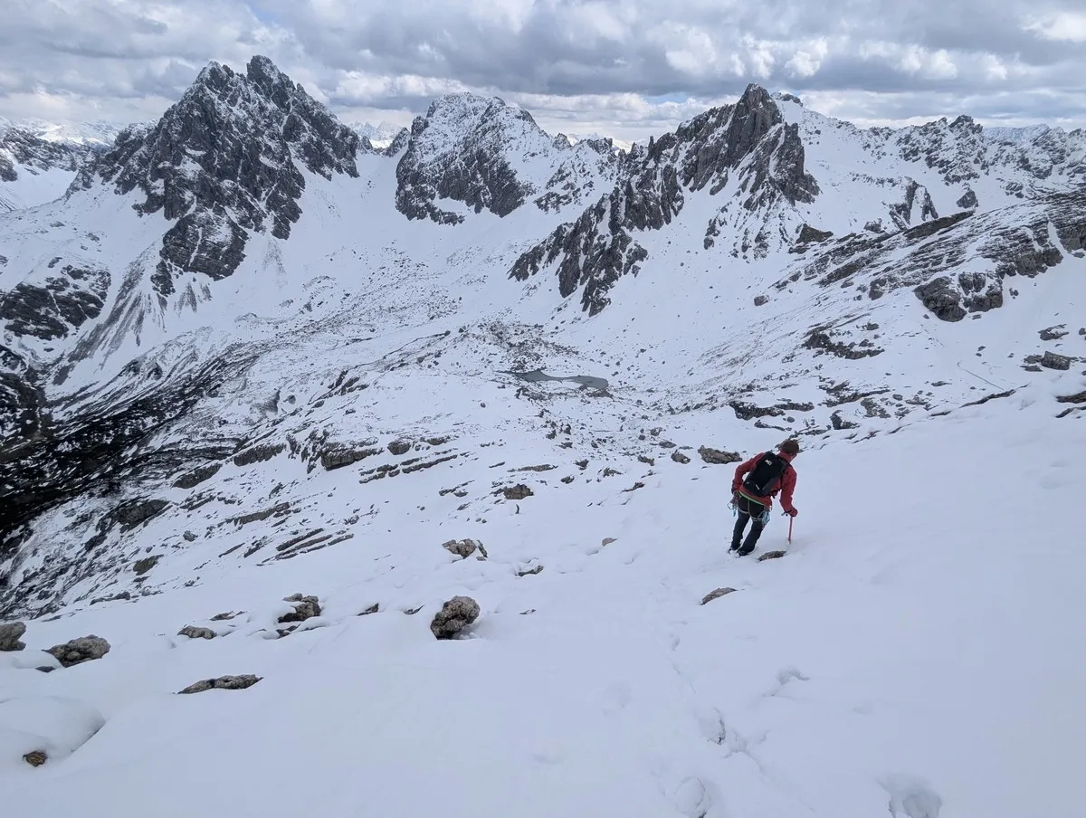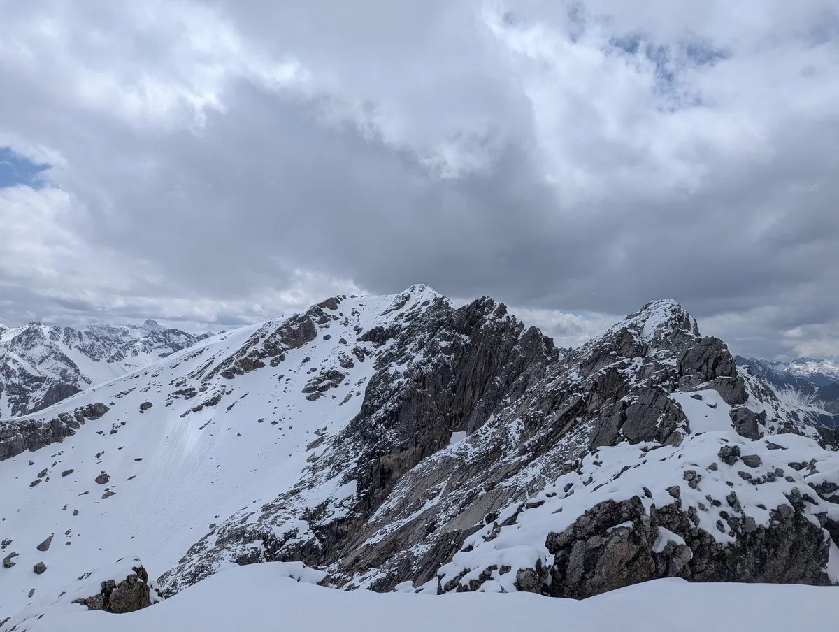 Wer überlegt, zur Westlichen Plattigspitze weiterzugehen: Die zehn Extrameter Höhenunterschied lohnen kaum. Der Übergang ist brüchig und wenig lohnend – also lieber das Gipfelpanorama genießen und wieder auf bekanntem Pfad absteigen.