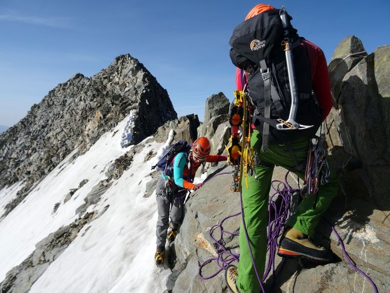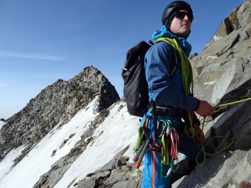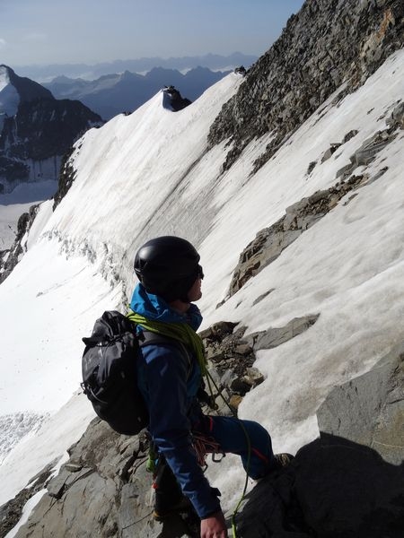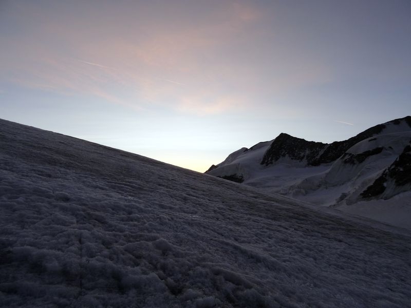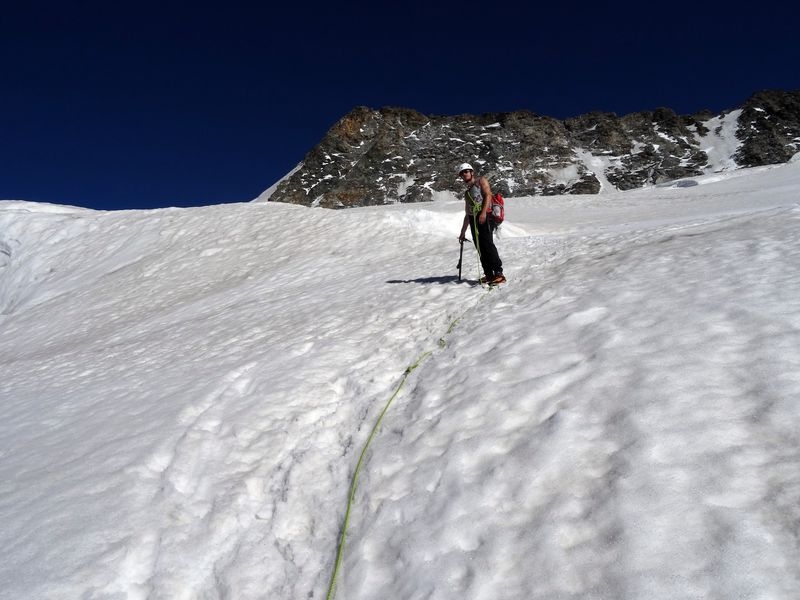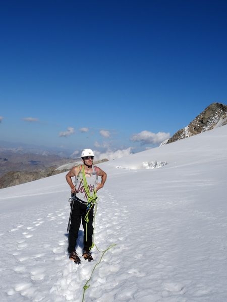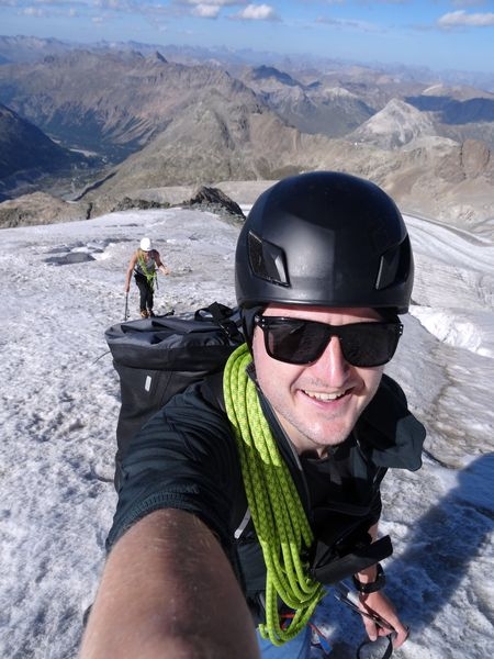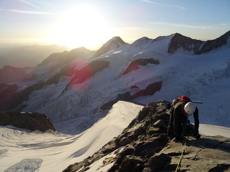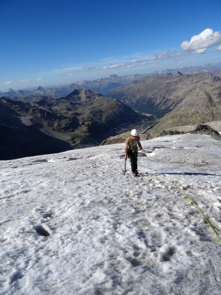 Nach dem Frühstück um 6 Uhr morgens folgen die letzten rund 450 Höhenmeter. Anfangs geht es den Gletscher wieder hoch, ehe der Einstieg zum Spallagrat (II+) folgt. Für diesen benötigt man etwa 1,5 Stunden bis zum Gipfel des Piz Bernina. Der Spallagrat ist deutlich länger als der Fortezzagrat, von der maximalen Schwierigkeit aber in etwa gleich.