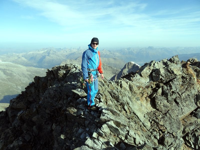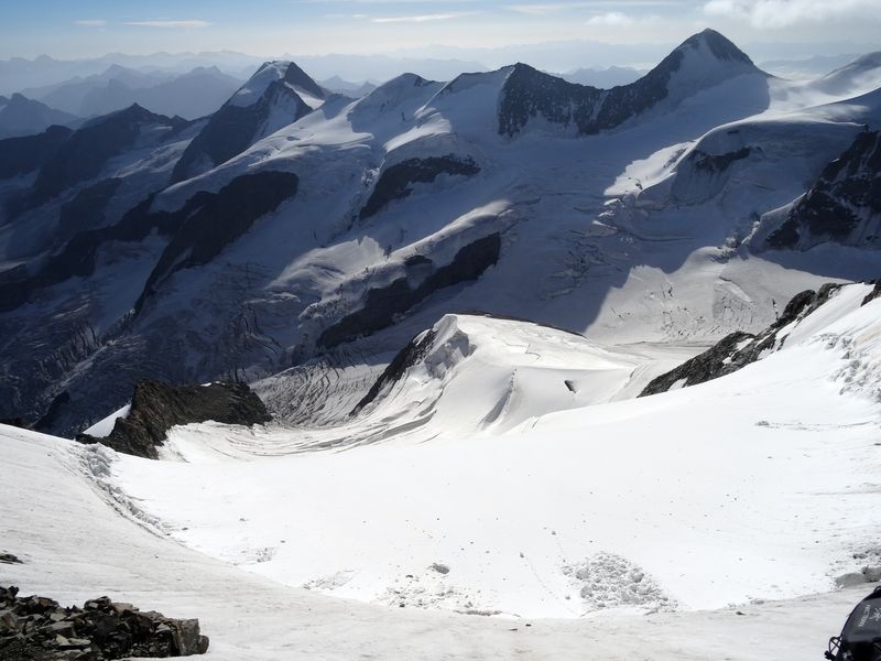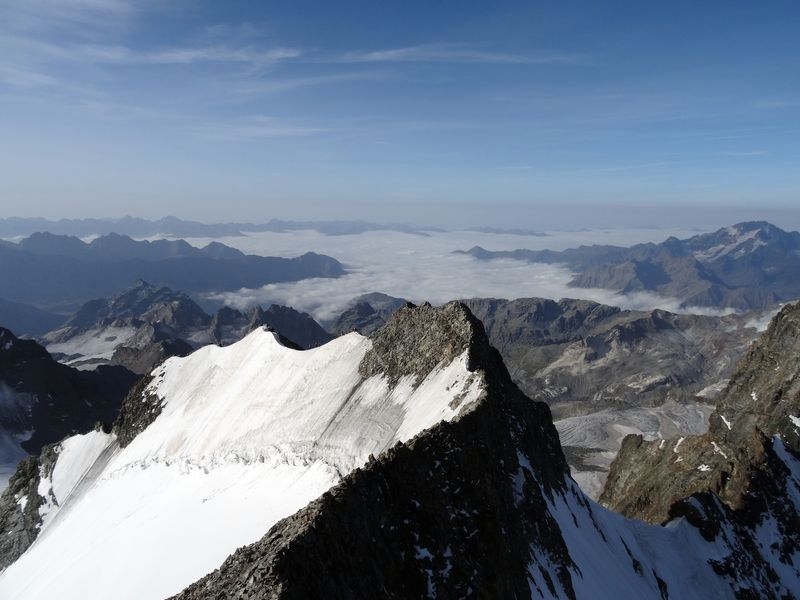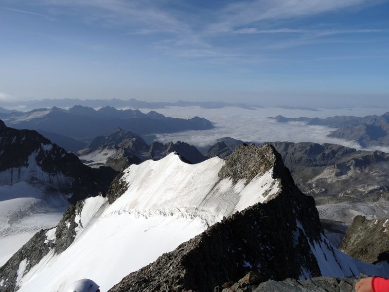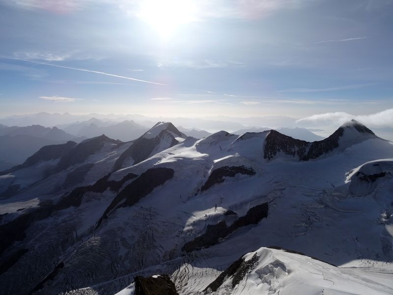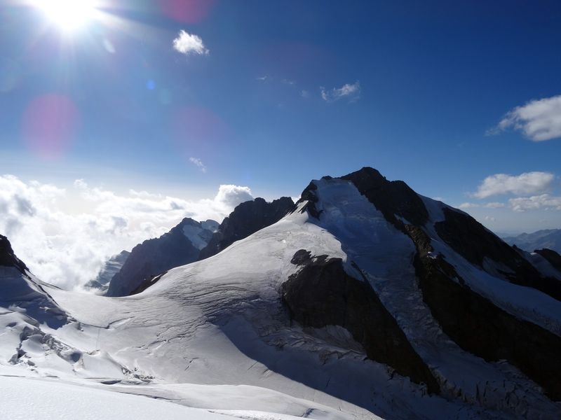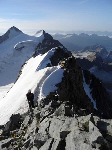Der Gipfel des Bernina (4.049 m) liegt gerade noch in der Schweiz, nur zweihundert Meter weiter südlich beginnt bereits Italien. Vom Piz Bernina hat man im Idealfall eine Sicht auf über 300 km weit.