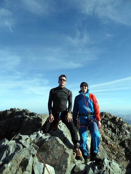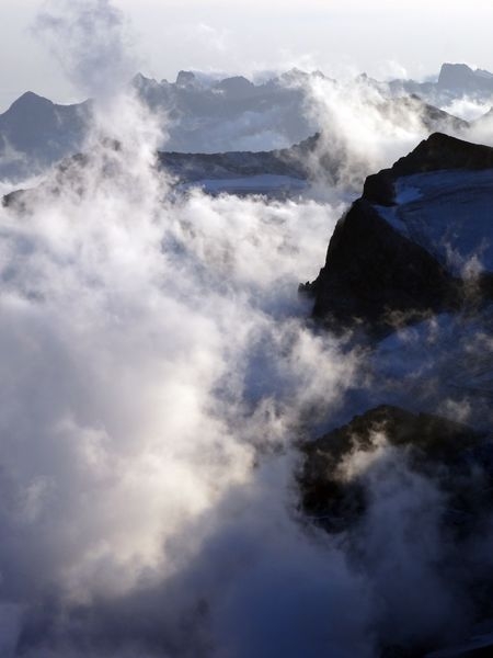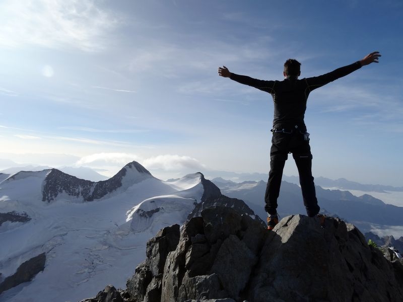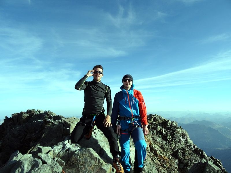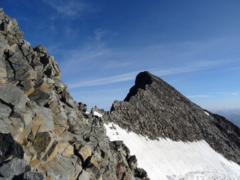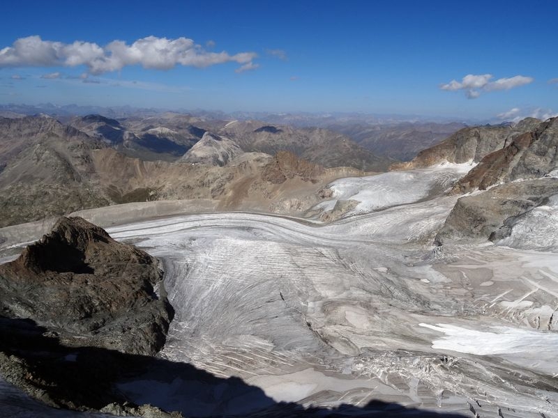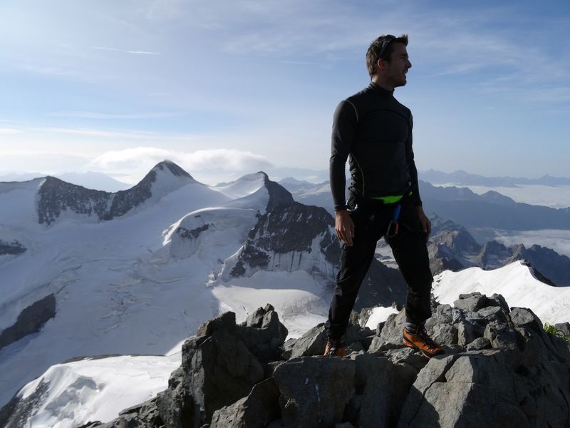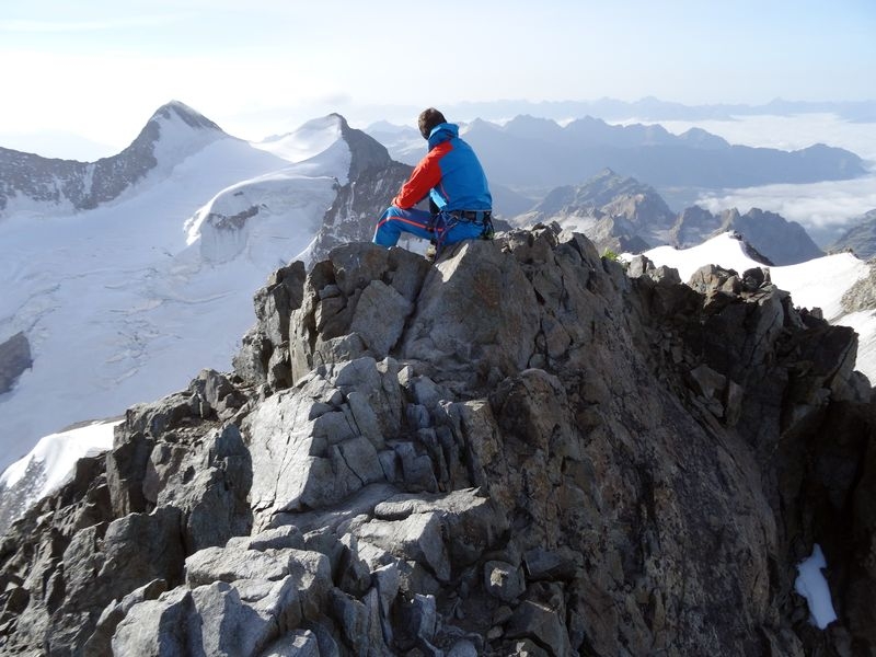 Der Gipfel des Bernina (4.049 m) liegt gerade noch in der Schweiz, nur zweihundert Meter weiter südlich beginnt bereits Italien. Vom Piz Bernina hat man im Idealfall eine Sicht auf über 300 km weit.
