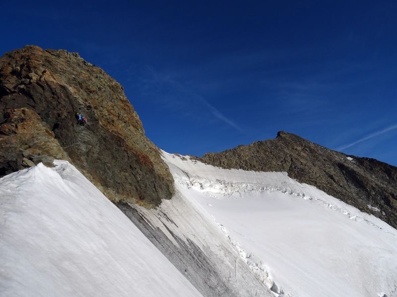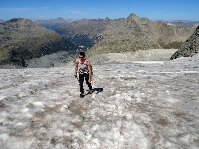 Wir wählten den Spallagrat (also die Zweitagestour), verzichteten aber auf Bahnunterstützung (Diavolezza) und wählten anfangs den direkten Weg auf den Morteratsch-Gletscher (anstatt rechts zur Bovalhütte aufzusteigen). Am Gletscher sollte man sich links halten. Danach ging es links in Kehren Richtung Isla Persa hoch. Richtung Bellavista Trasse, die auf etwa 3.700 Metern Höhe liegt, wird nun der Fortezzagrat (III) überschritten und lange den Gletscher bergauf gegangen. Ist die traumhafte Bellavista Terrasse erreicht sind rund 2.000 Höhenmeter Aufstieg geschafft. Nun geht es wieder etwas bergab zur Hütte Rif. Marco e Rosa, auf der auf über 3.600 Metern Höhe übernachtet wird.