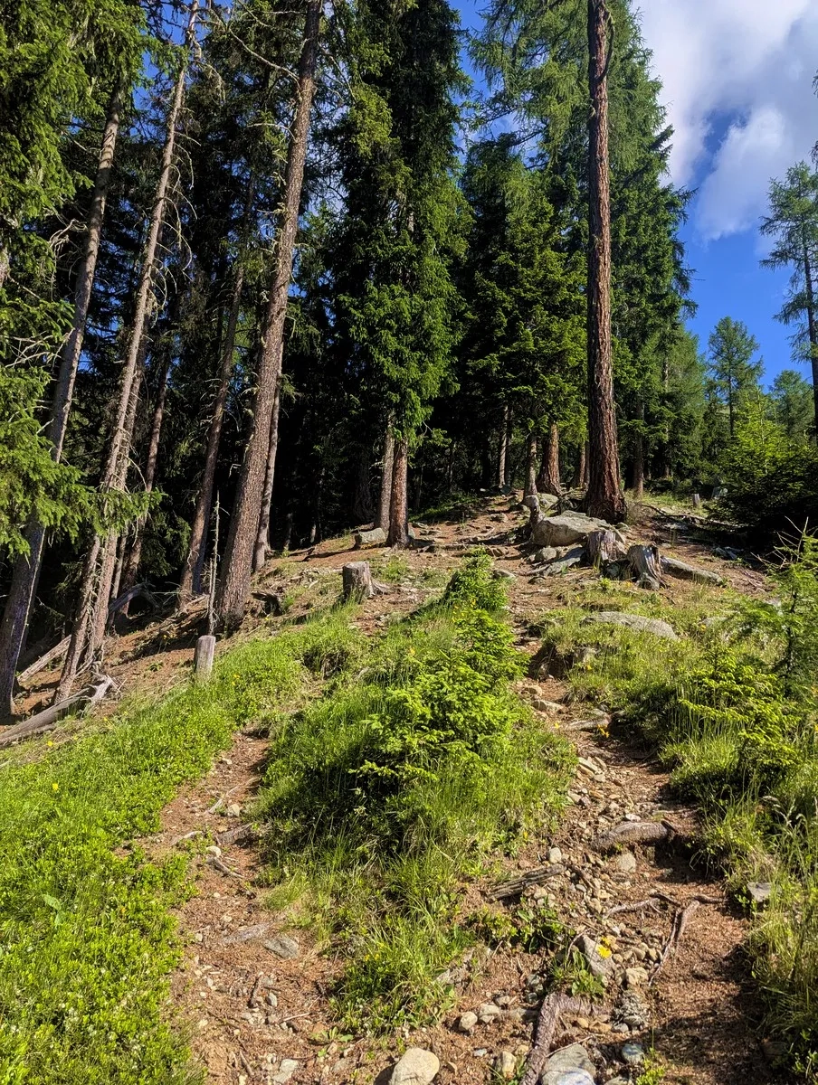 - Der Steig kreuzt auf etwa 1.830 m die Forststraße, aber man bleibt schön aufwärts. Die nächsten 400 Höhenmeter sind ein steiler Sprint durch den Wald – der perfekte Test für Waden und Lungen.