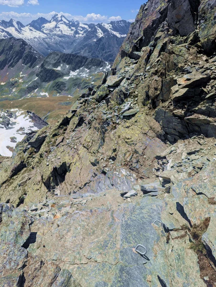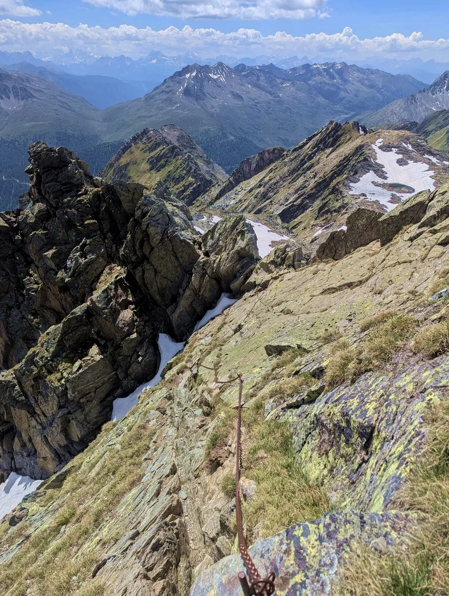 - Das letzte Stück zieht sich am Grat entlang. Einige Passagen sind luftig, aber mit Drahtseil und Tritten entschärft. Kein Ort für Handyspiele – volle Konzentration und klare Schritte sind gefragt.