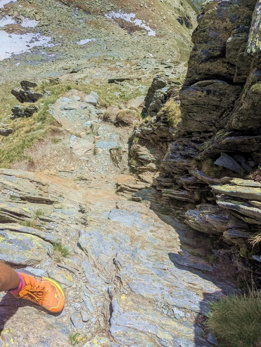 Bei trockenem Wetter reichen gut profilierte Trailschuhe. Wer sich sicherer fühlt, greift zu leichten Bergschuhen. Dicke Bergtreter? Braucht’s hier nicht – lieber Gewicht sparen für ein zusätzliches Müsliriegelpaket.