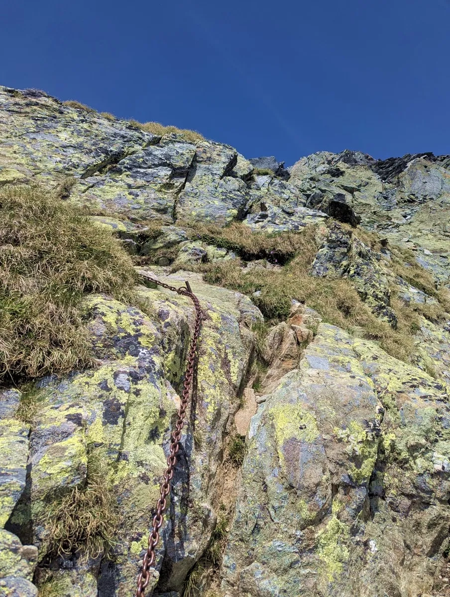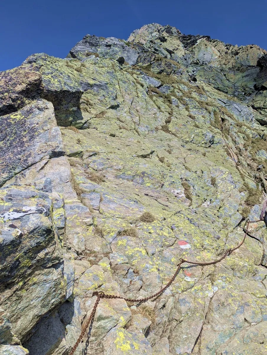 Die Route ist technisch eher moderat, verlangt aber beim Gipfelaufbau kurze, einfache Klettereinlagen im Bereich UIAA 1 sowie einen Hauch Schwindelfreiheit. Im finalen Abschnitt helfen ein Fixseil, Trittstifte und Griffe – eine Art alpiner Klettersteig light, aber ohne den ganzen Metallzirkus.