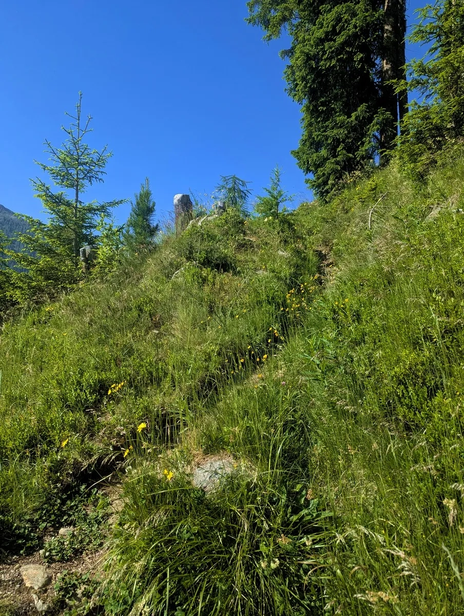 - Dem Wanderweg 12A folgen. Kurze Zeit später nicht links Richtung Seespitzhütte wandern – das ist später dran. Stattdessen rechts den steilen Pfad bergauf nehmen. Keine Sorge, der Wald motiviert mit kühlem Schatten.