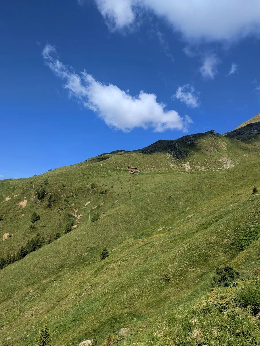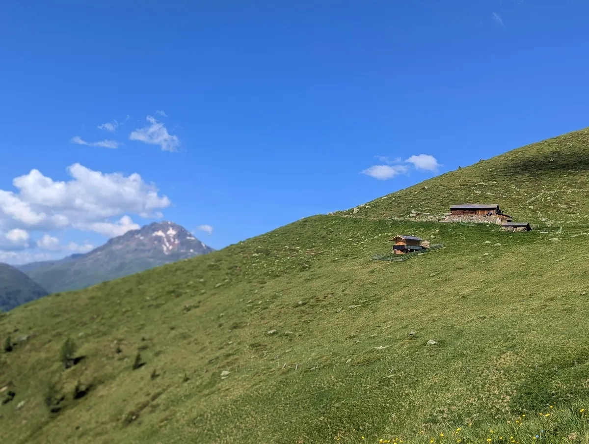 - Auf ca. 2.250 m wird es entspannter. Hier quert man nach links, kommt an einer Alm mit Trinkbrunnen (Getränke gegen freie Spende!) vorbei und betritt den sogenannten Blumenweg Oberseite – der Name ist Programm.