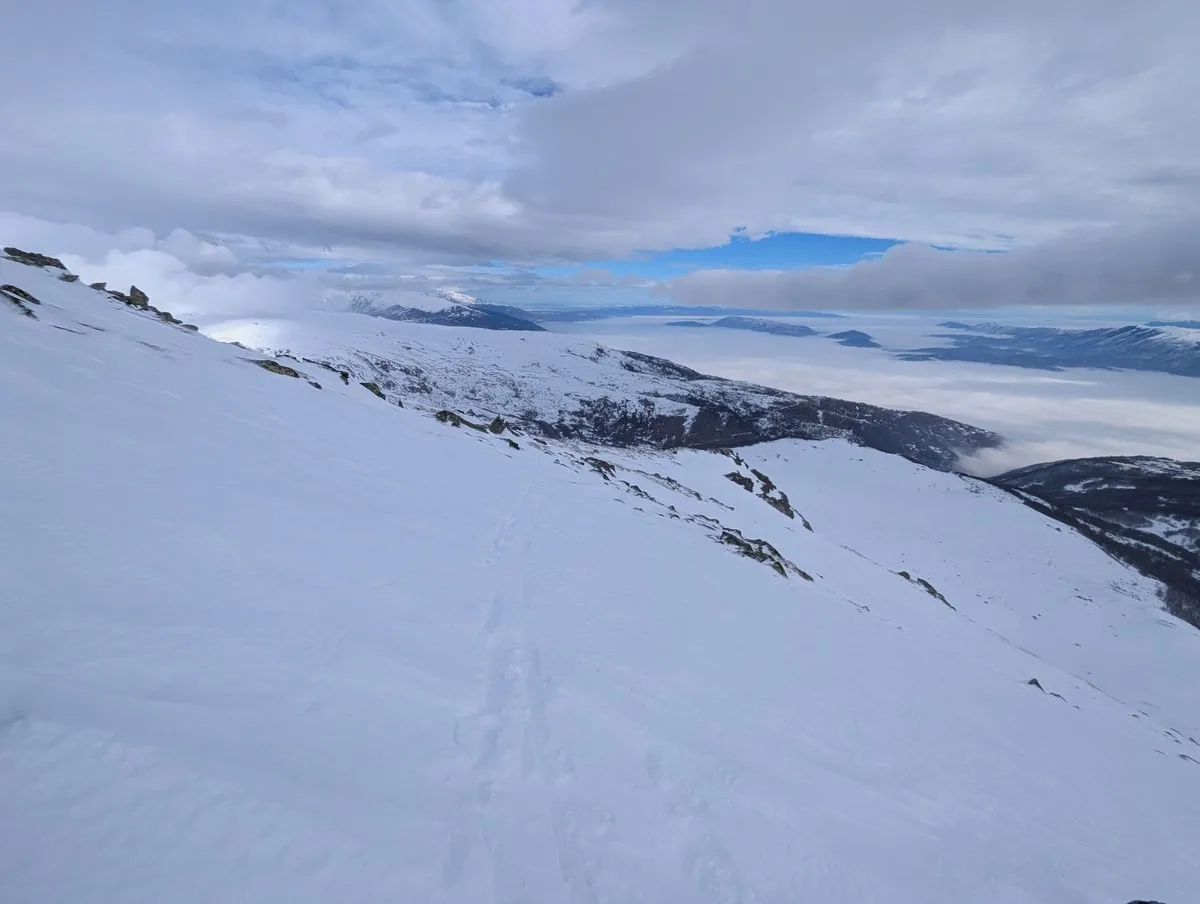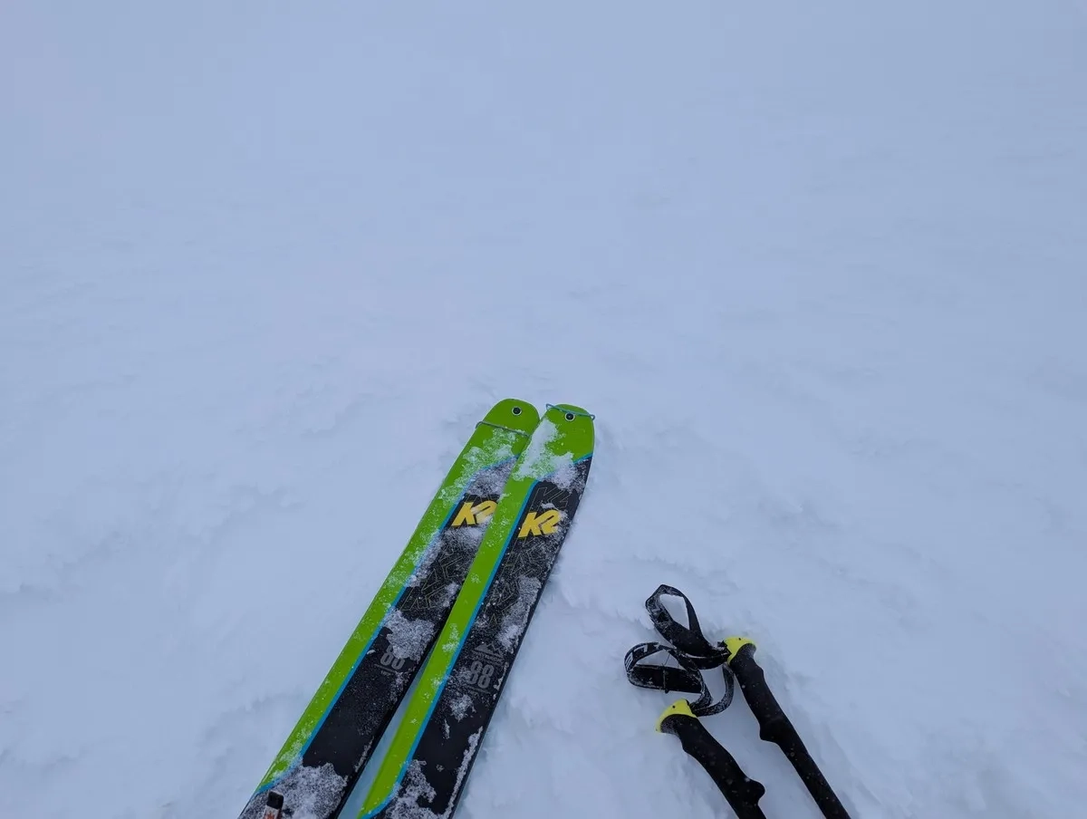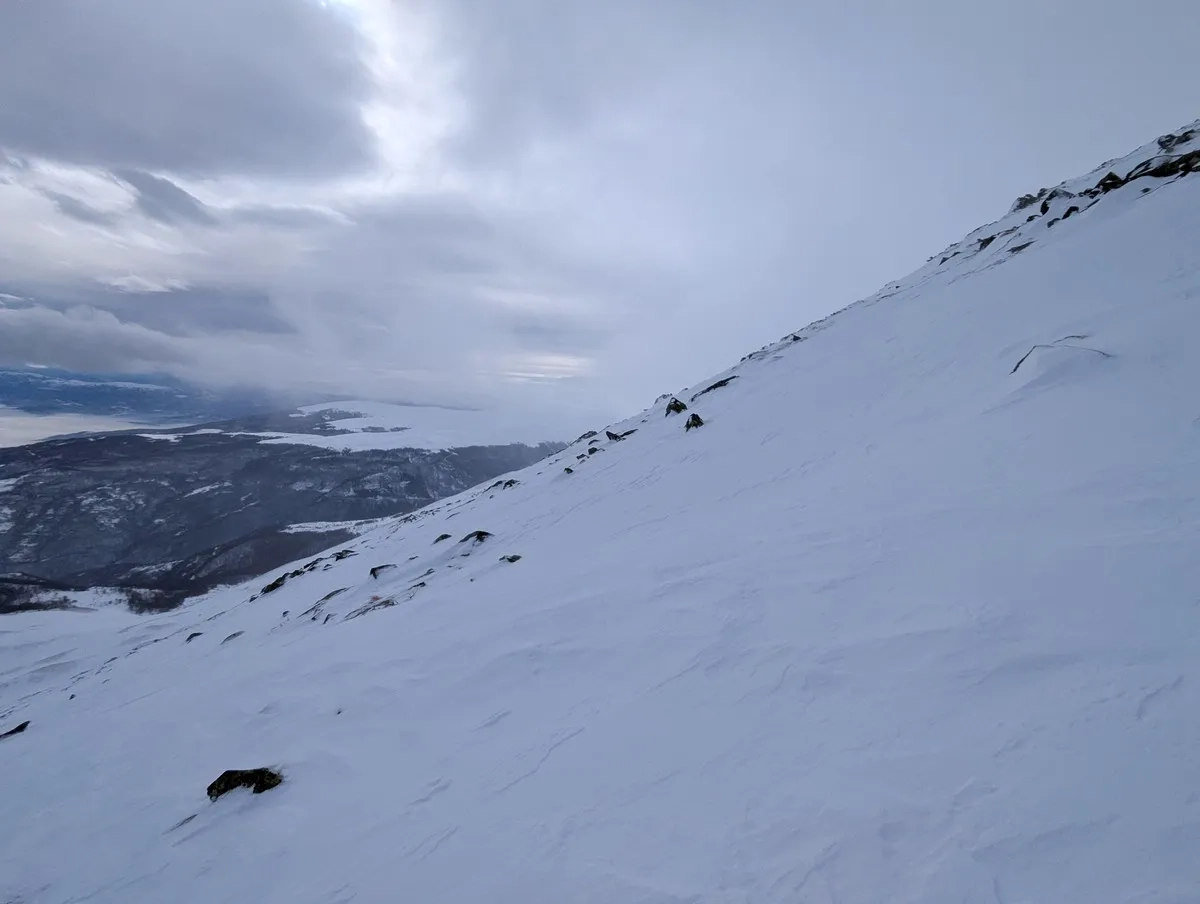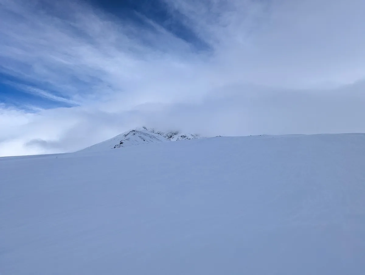 - Die klassische Route führt auf den Grat, wo der Wind gelegentlich Schnee abgetragen hat, was Abschnitte ohne Ski nötig macht. Alternativ bietet die breitere Passage mehr Komfort und besseren Schnee.
