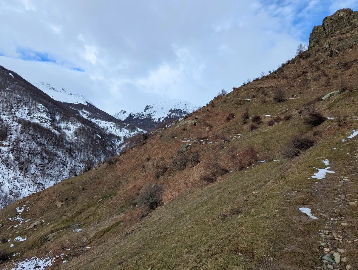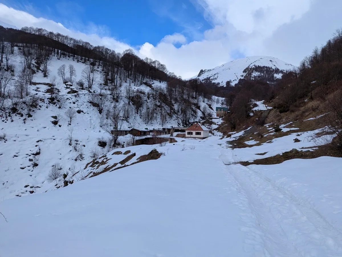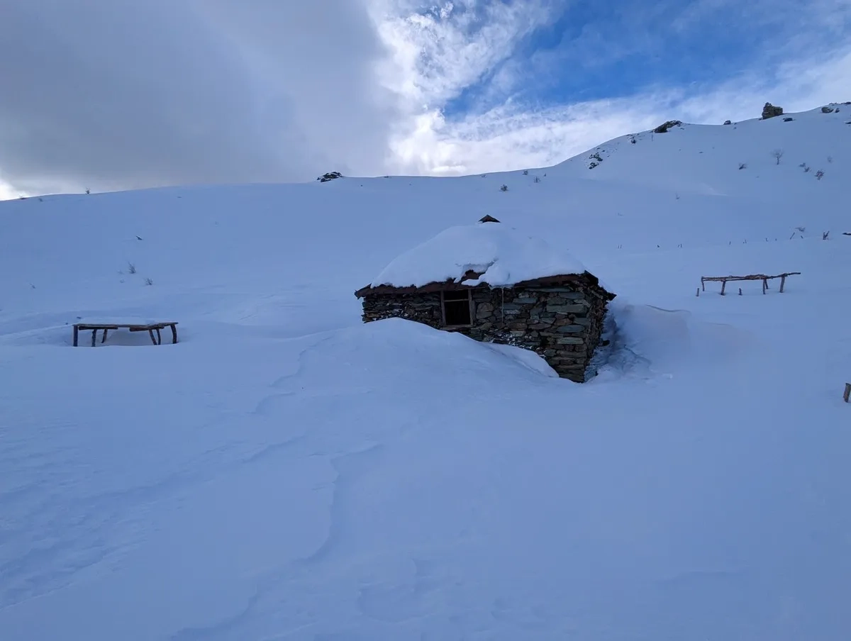 - Nach der Brücke verlässt man die Forststraße nach rechts und folgt einem Hang Richtung Süden, vorbei an einem Waldrand und über einen steileren Hang bis zu den alten Steinhütten auf etwa 1.700 Metern Höhe.