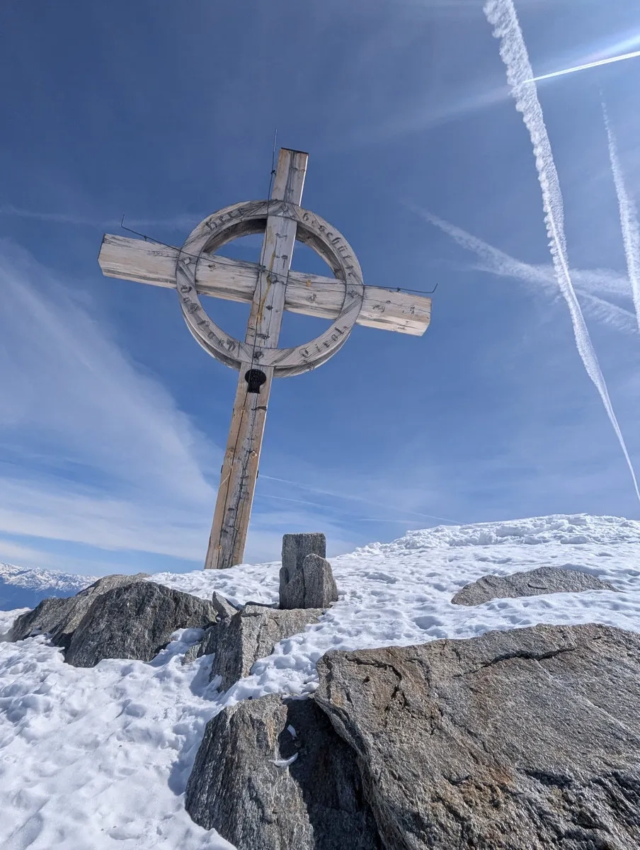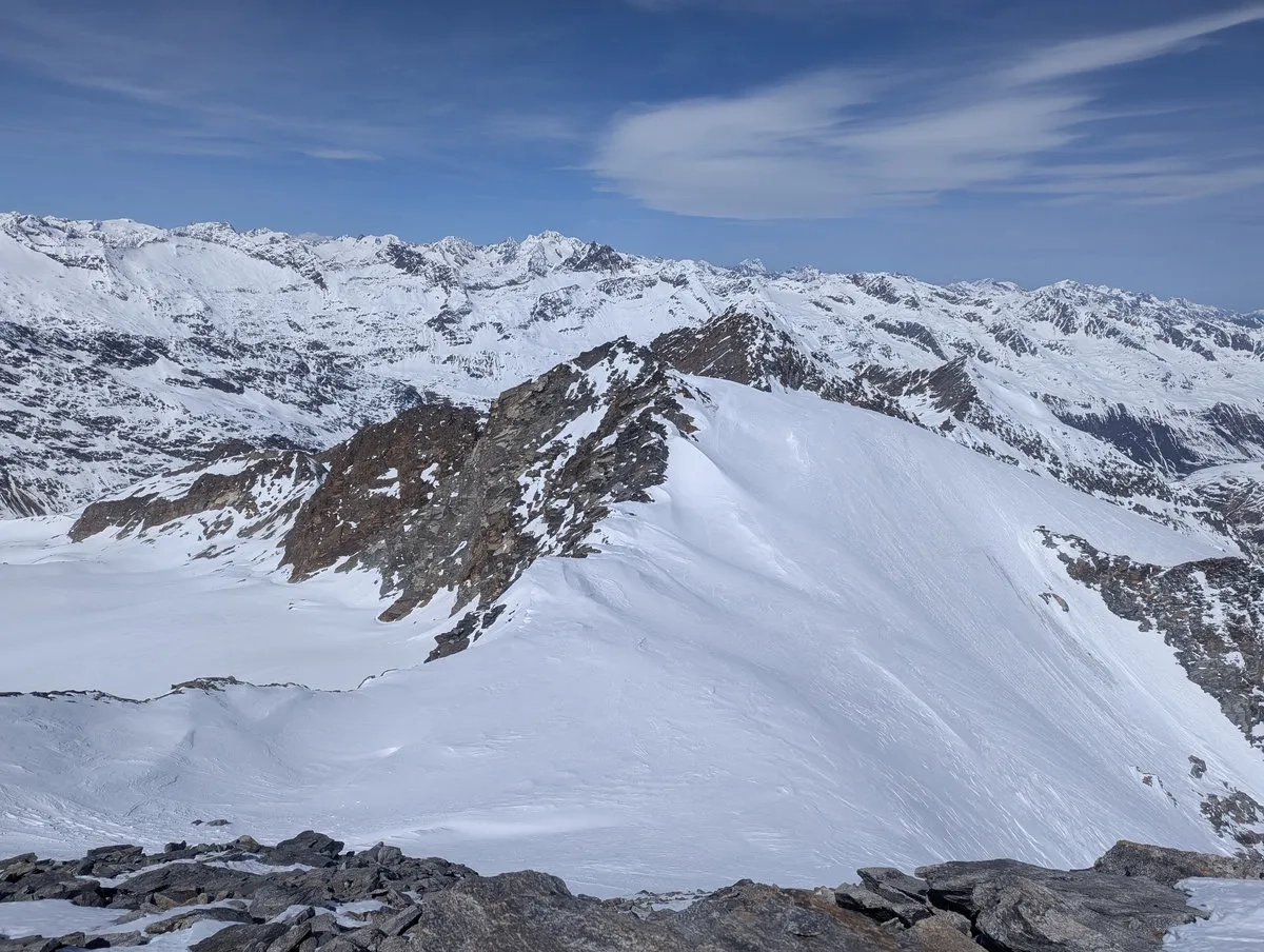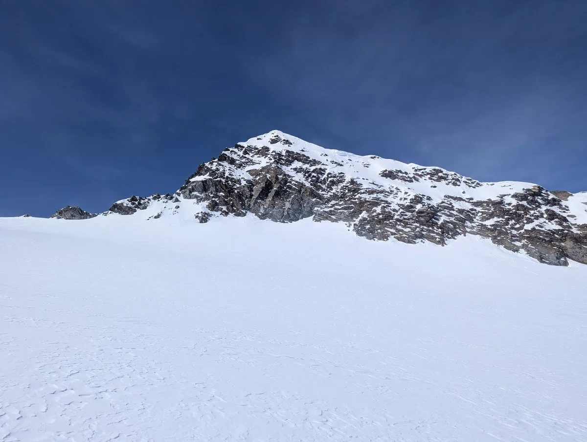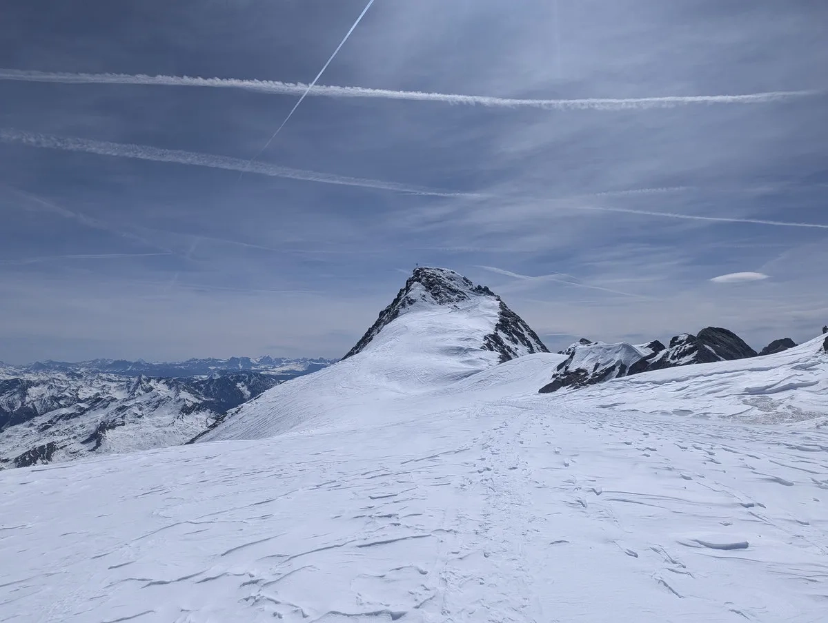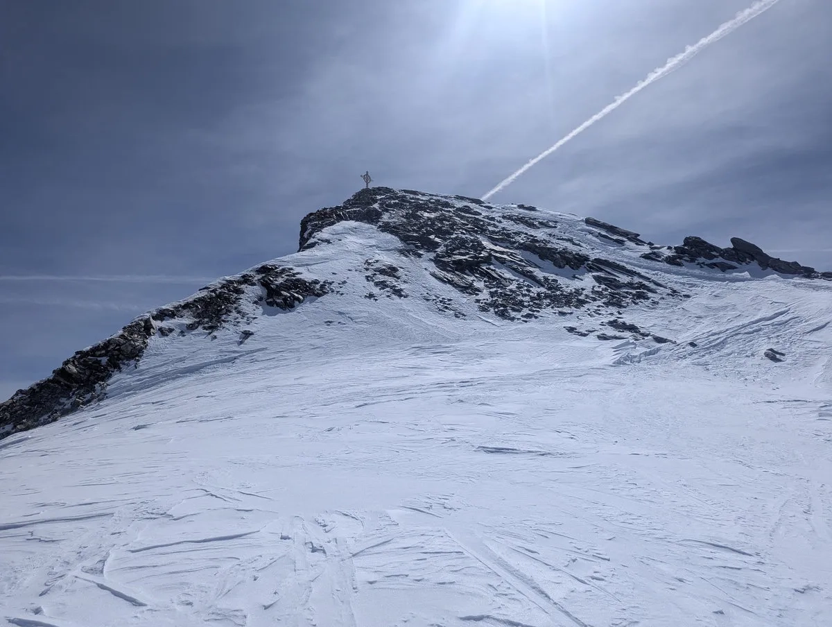 - Nun folgt der Schlussteil nach Südosten bis zum 3.475 Meter hohen Gipfel. Bei guter Schneelage geht das problemlos mit Ski. In schneearmen Wintern heißt es: abschnallen und die letzten Meter zu Fuß absolvieren. Der Gipfel wartet geduldig.