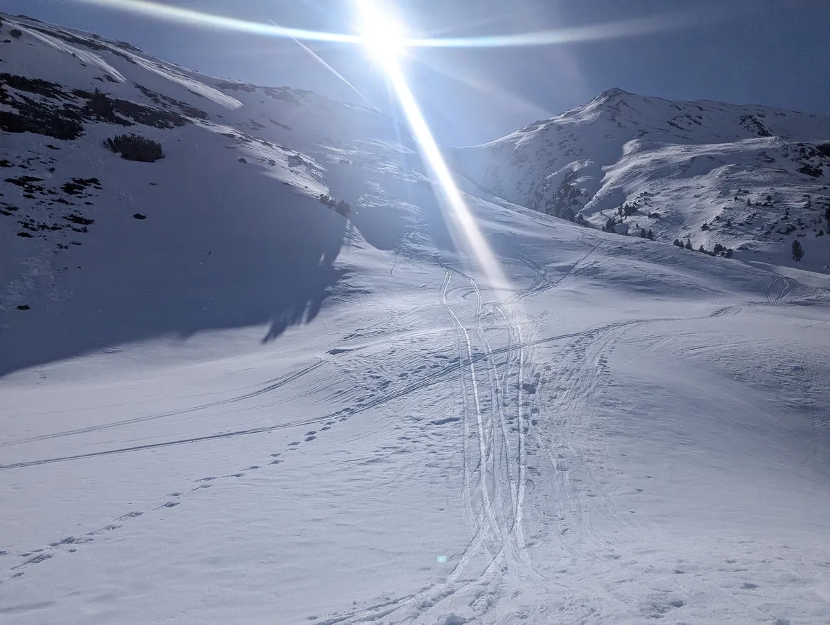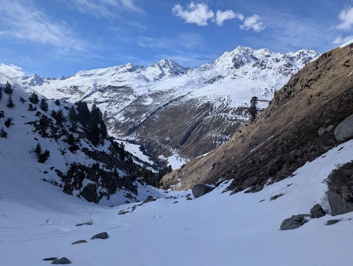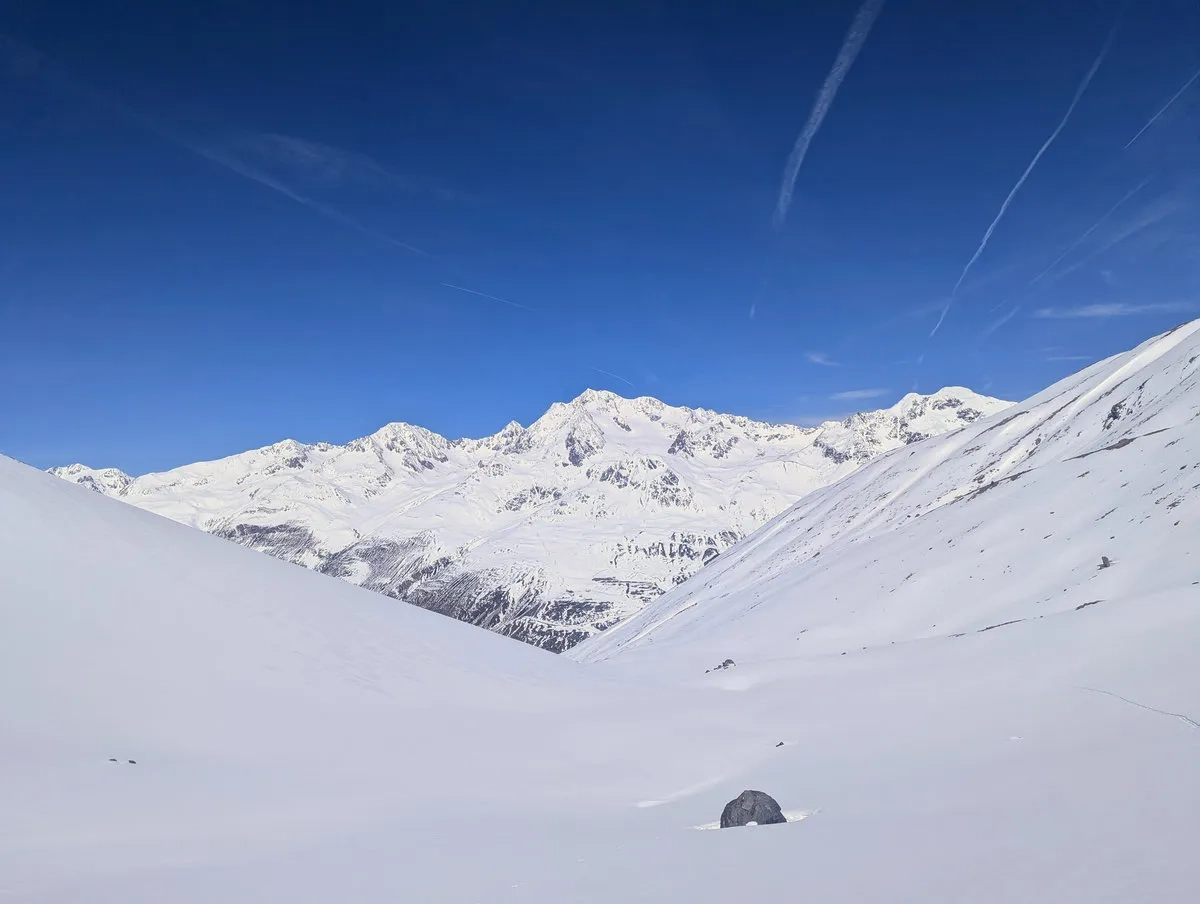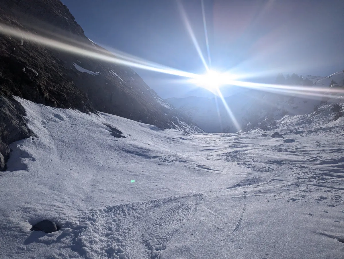 Nach einem großteils schneearmen Winter 2025/26 hatte ich Anfang April dieses Glück nicht, aber der großartigen Tour hat es keinen Abbruch gemacht. Wer später im Frühling startet und noch ein paar ordentliche Schneefälle abbekommt, hat womöglich bessere Chancen. Dafür wartet dann eine andere kleine Freude: Ski tragen im unteren Abschnitt, weil der Frühling dort schneller ist als man selbst. Ich hatte nach starken Schneefällen eine Woche zuvor immerhin das Glück, durchgehend mit den Skiern aufzusteigen und abzufahren. Man nimmt, was man kriegt.