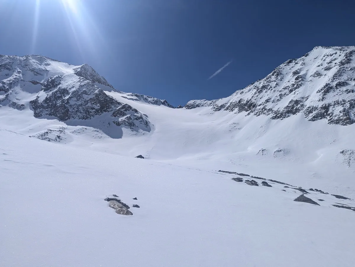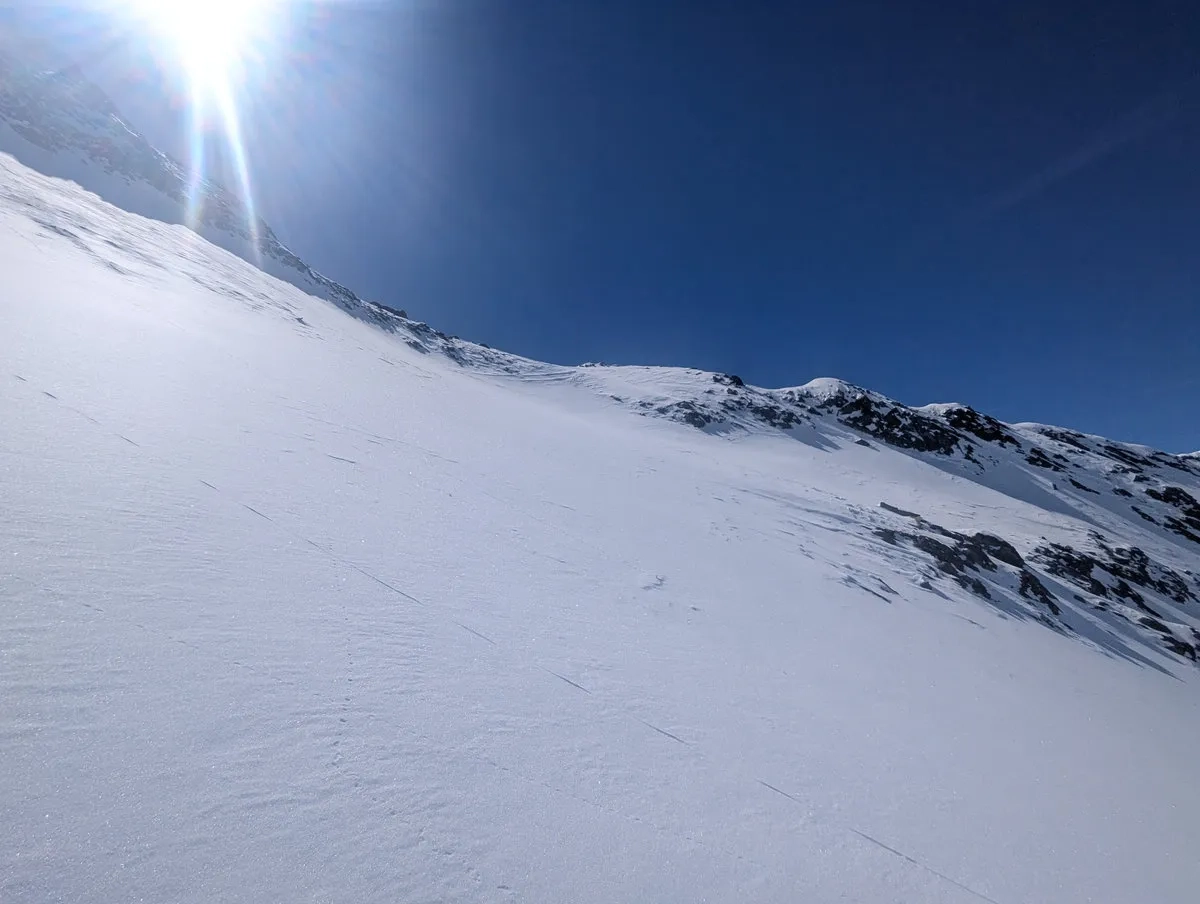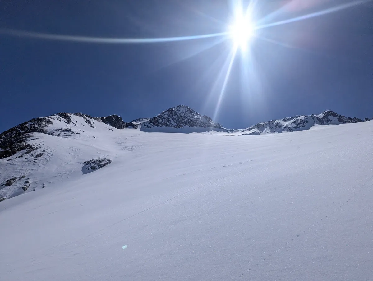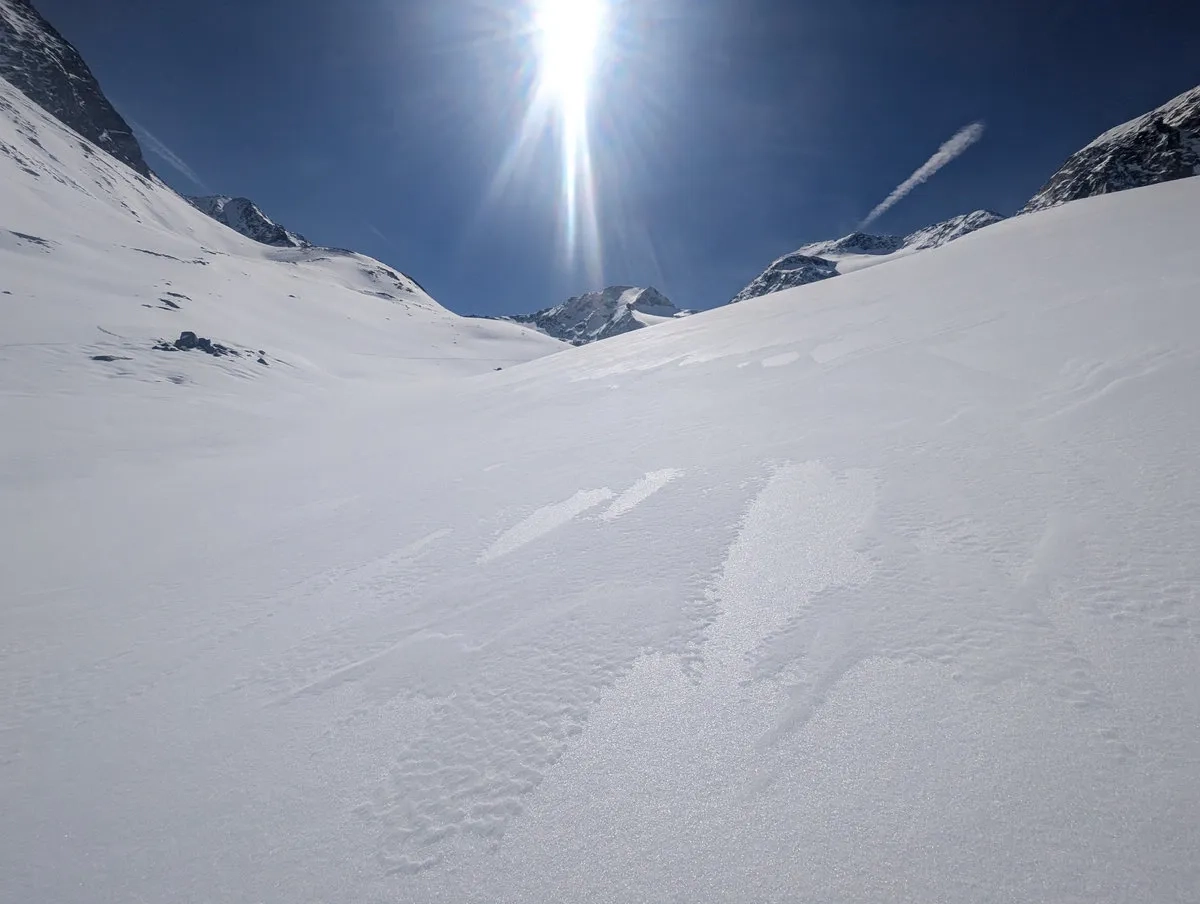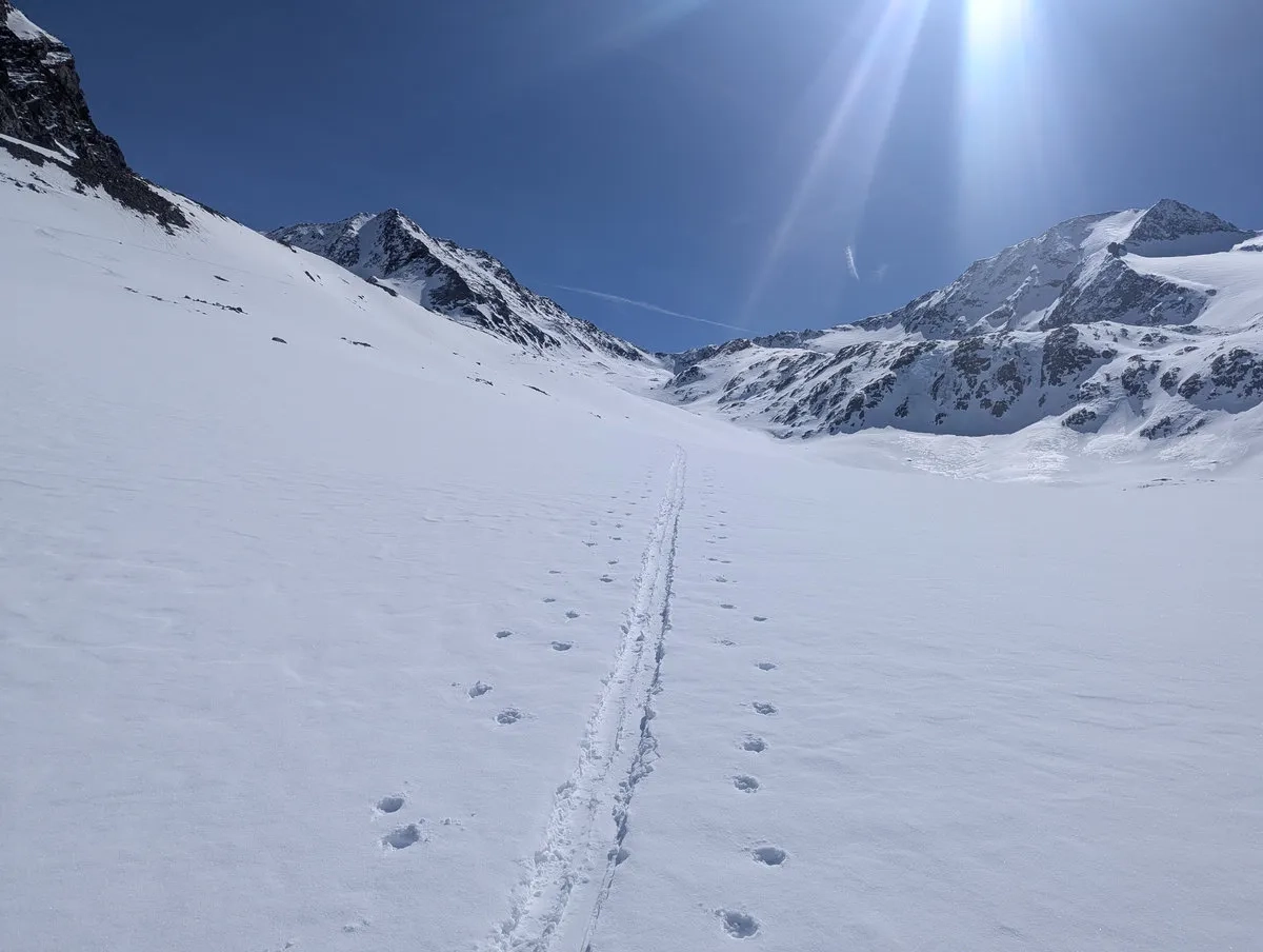 Anspruchsvoll sind zudem die Steilstufen am Gletscher sowie der finale Gipfelhang, den ich leider nicht mehr erreicht habe. Diese Passage verlangt sichere Spitzkehrentechnik, Erfahrung im hochalpinen Gelände und ein gutes Gespür für Schnee und Gelände.