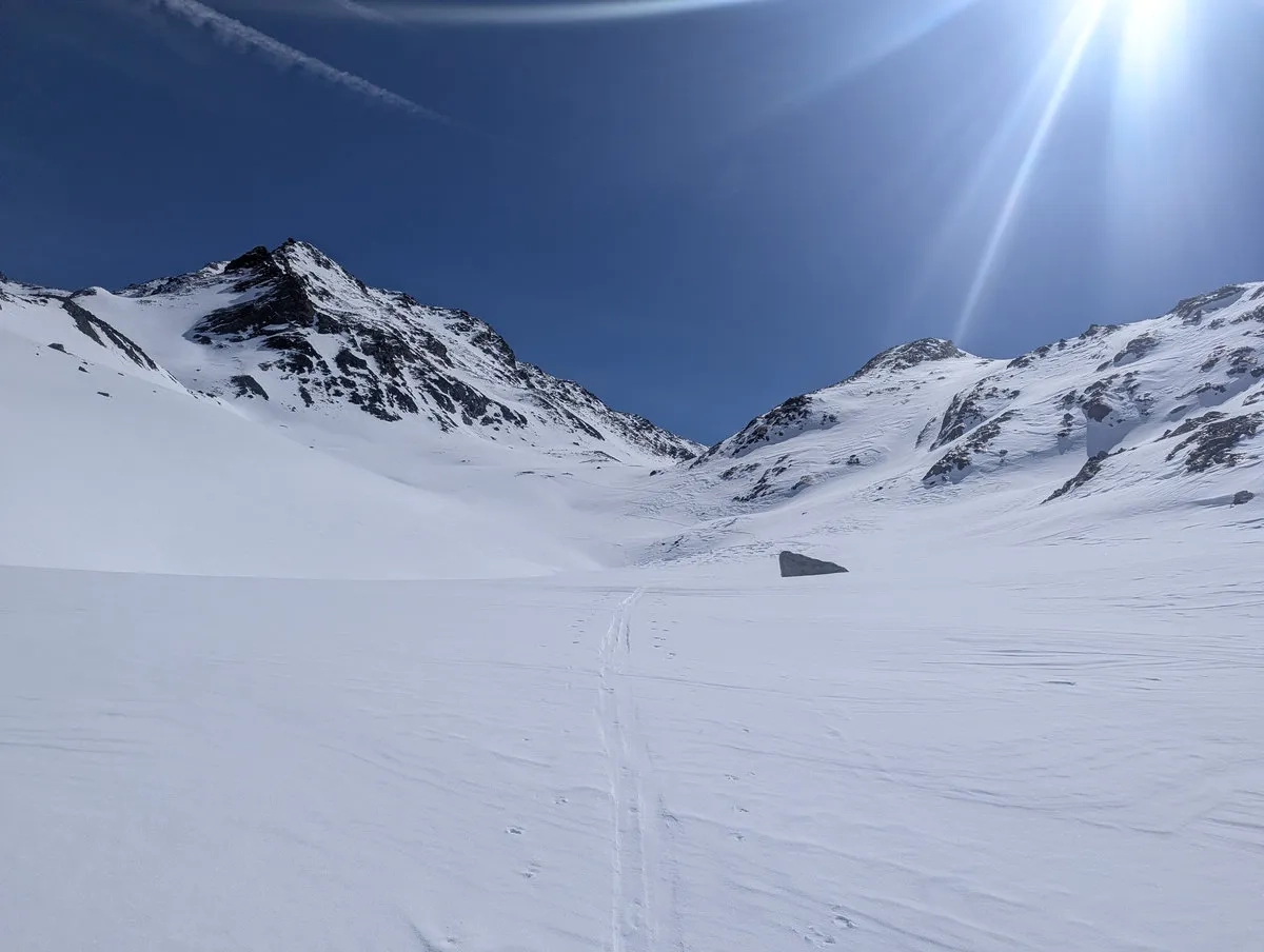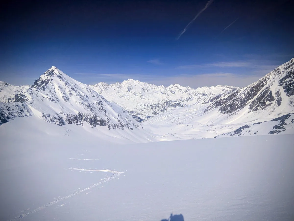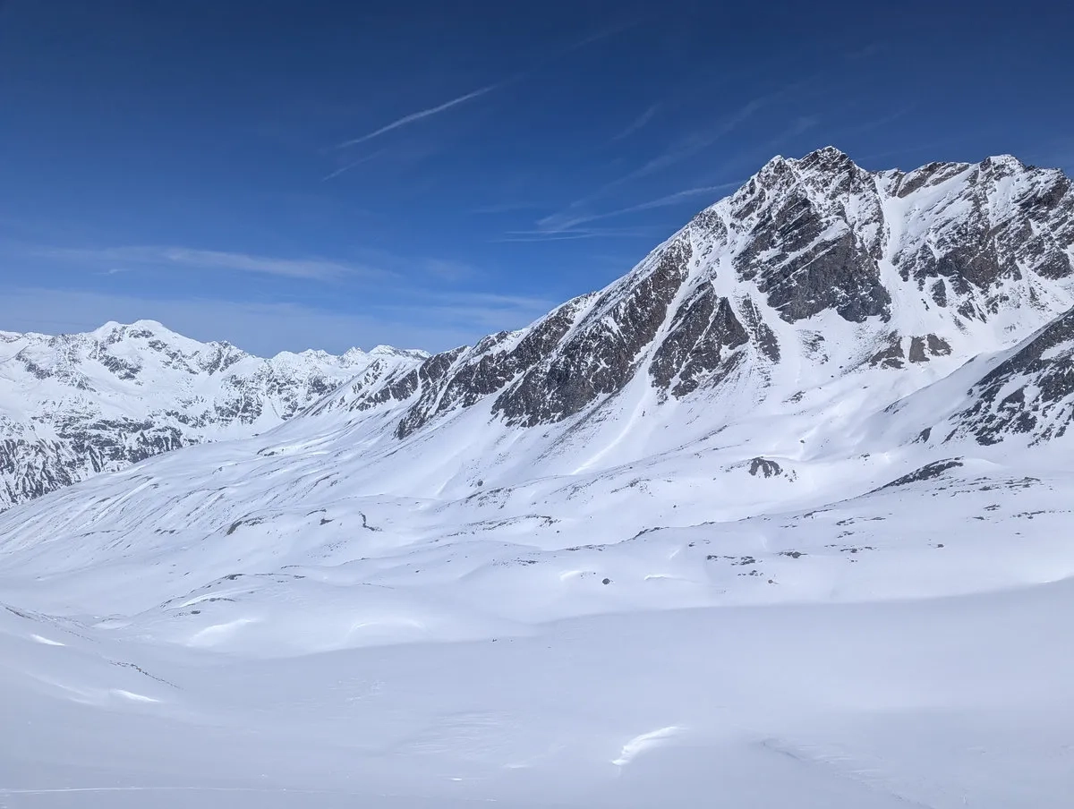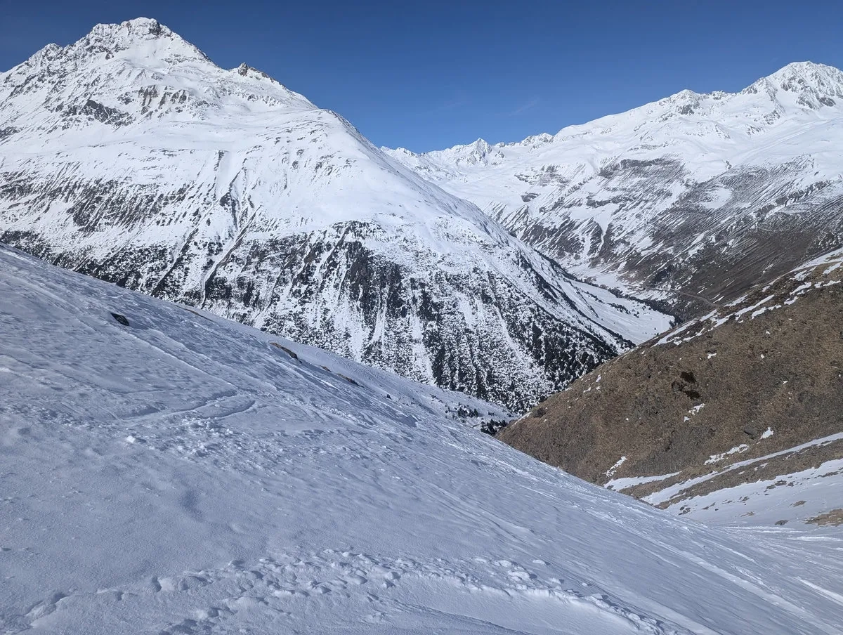 Anspruchsvoll sind zudem die Steilstufen am Gletscher sowie der finale Gipfelhang, den ich leider nicht mehr erreicht habe. Diese Passage verlangt sichere Spitzkehrentechnik, Erfahrung im hochalpinen Gelände und ein gutes Gespür für Schnee und Gelände.