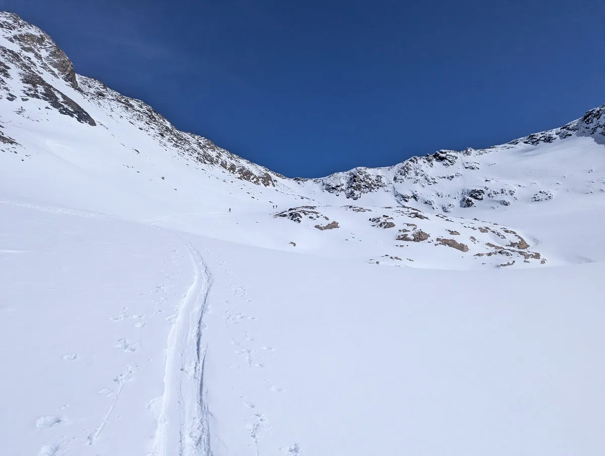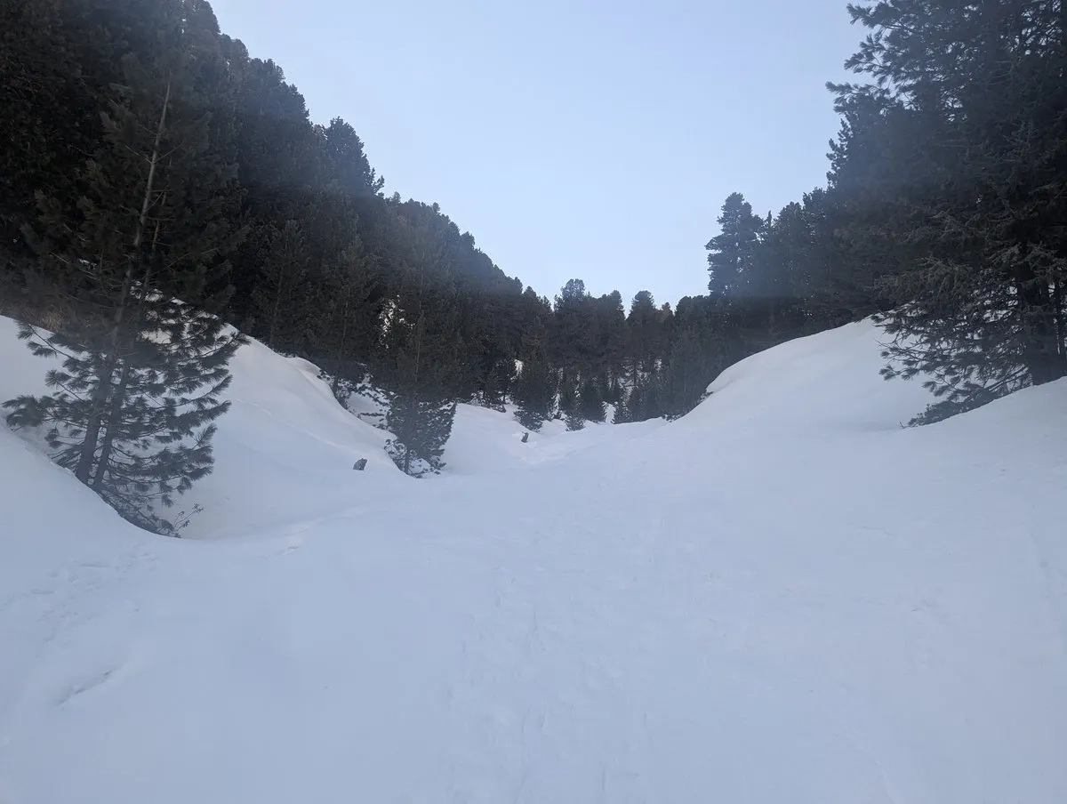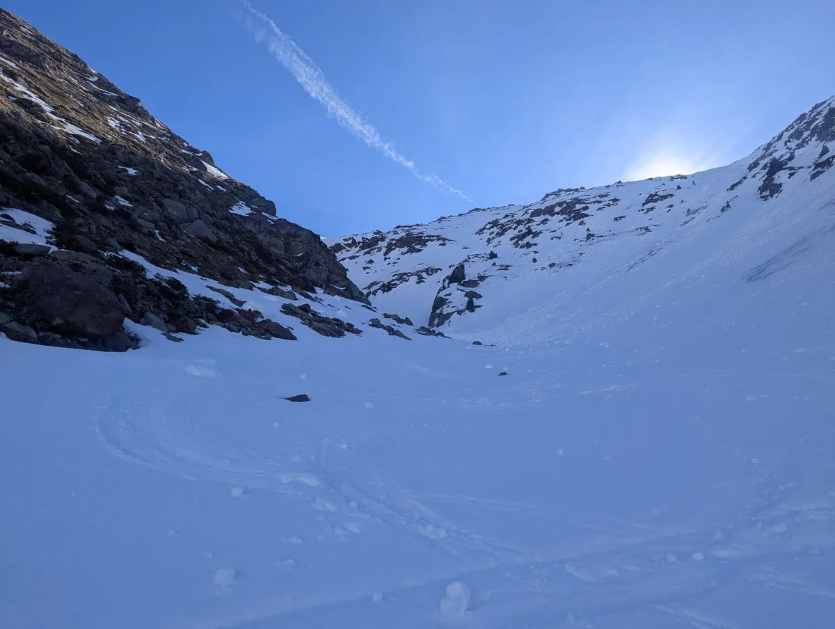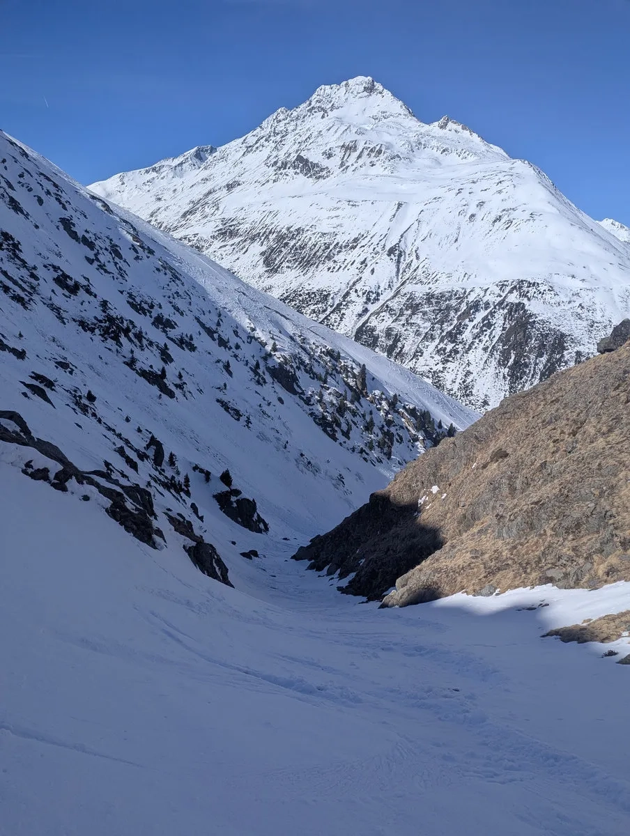 Der Weg durch die Schlucht sollte nur bei sicheren Lawinenverhältnissen gewählt werden. Andernfalls ist die Variante mit dem Linksbogen die deutlich vernünftigere Wahl, auch wenn sie etwas länger ist. Vernunft schlägt Ego, zumindest im Idealfall.