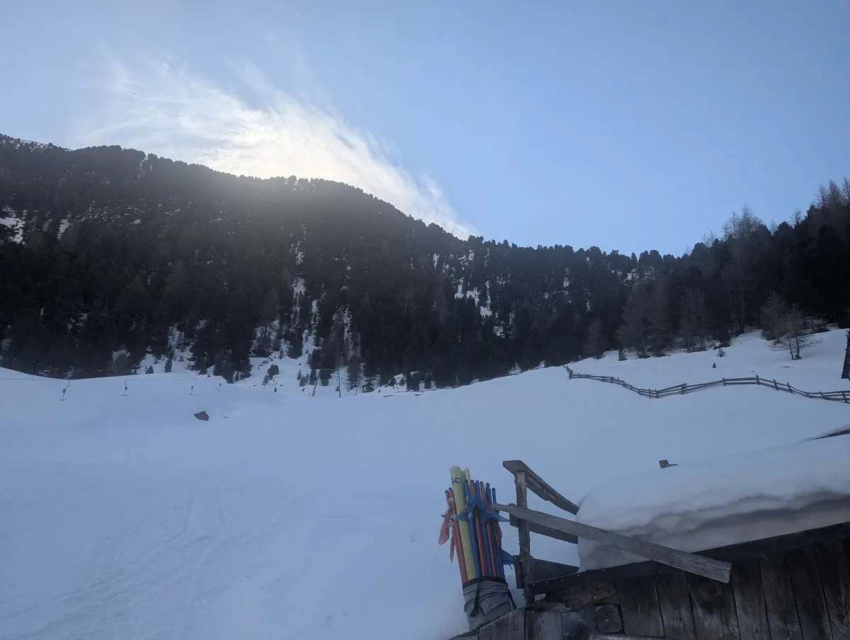 - Sofern ausreichend Schnee vorhanden ist, über die Piste aufsteigen und links neben den Schlepplift in den Wald hinein. Dort einem Wanderweg bis zur Ramolalm folgen. Bei schlechter Schneelage kann man am Sommerweg bis zur Ramolalm wandern. Ja, das bedeutet im Zweifel: Skitour beginnt mit Wandern. Charakterbildend.