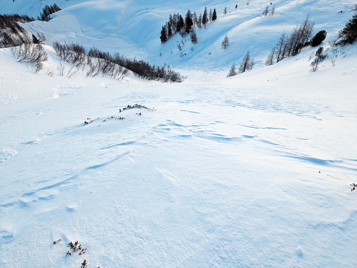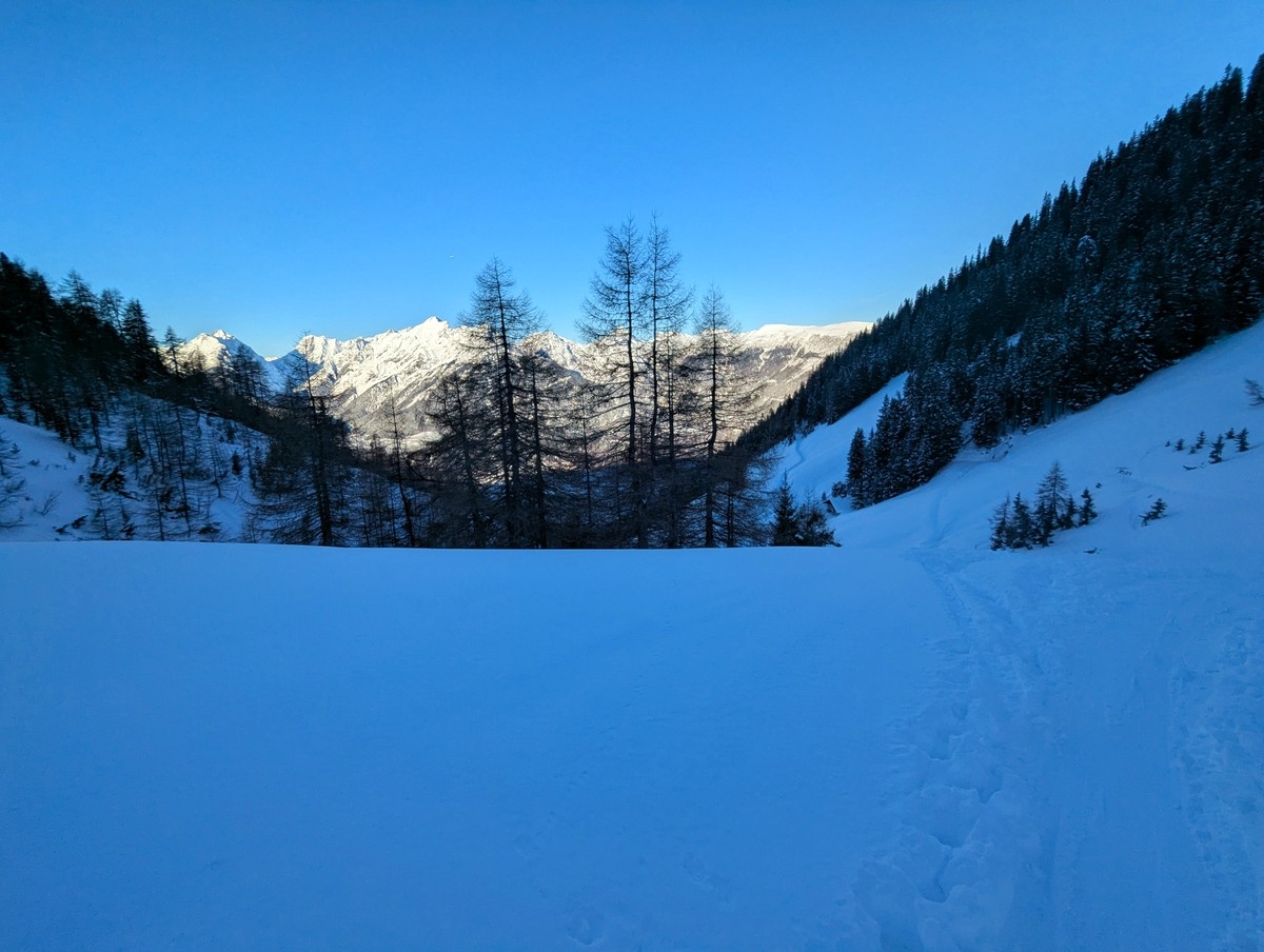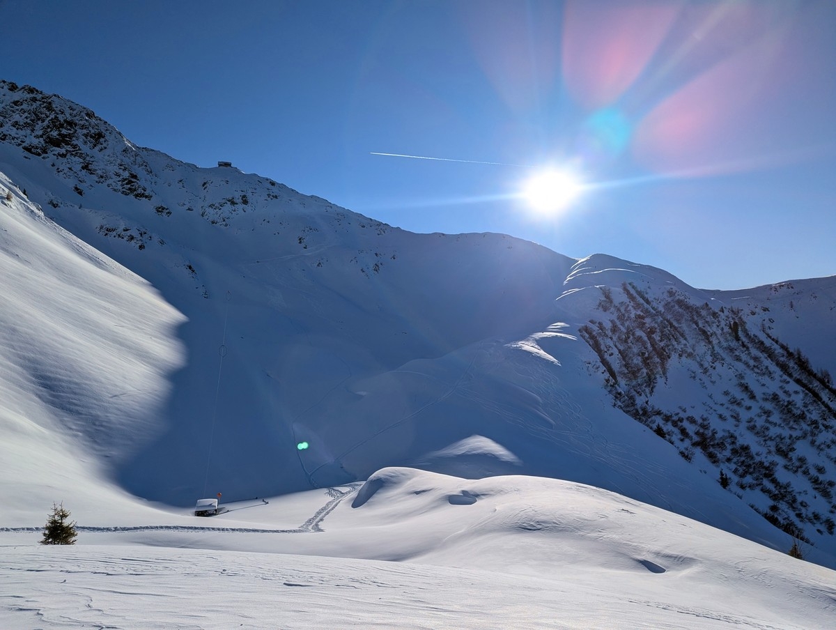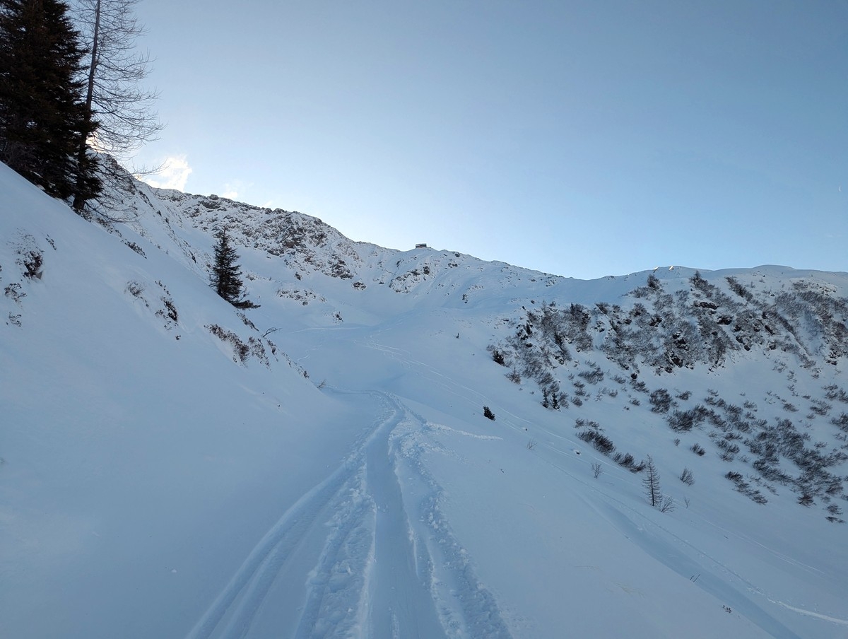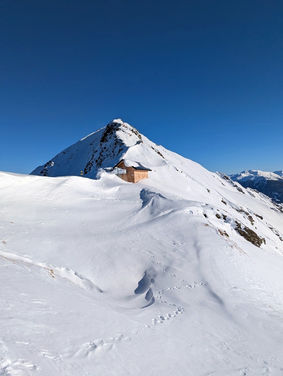 - Abfahrt: Viele entscheiden sich, direkt von der Hütte abzufahren. Alternativ bieten steile Nordhänge und die Gegend oberhalb der Materialseilbahn spannende Herausforderungen. Ein kurzer Zwischenanstieg ohne Felle zu diesen Abfahrten oberhalb der Materialseilbahn ist möglich.