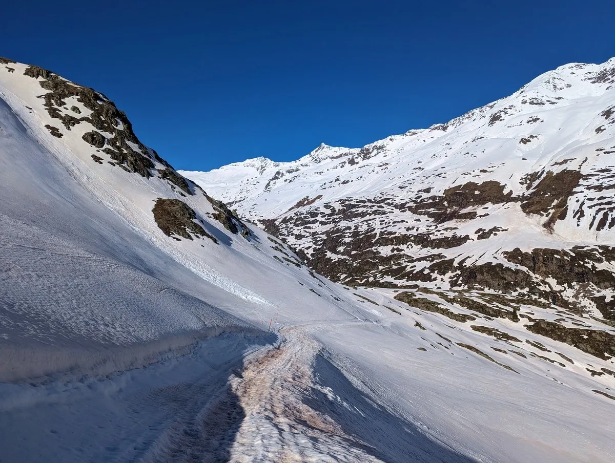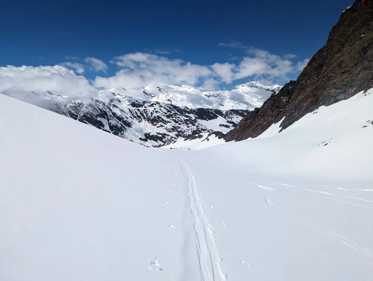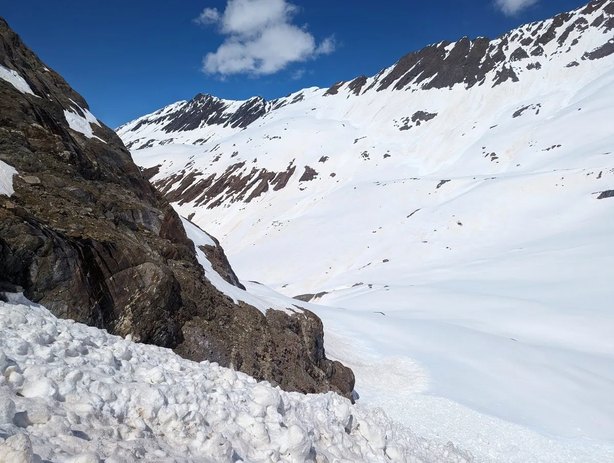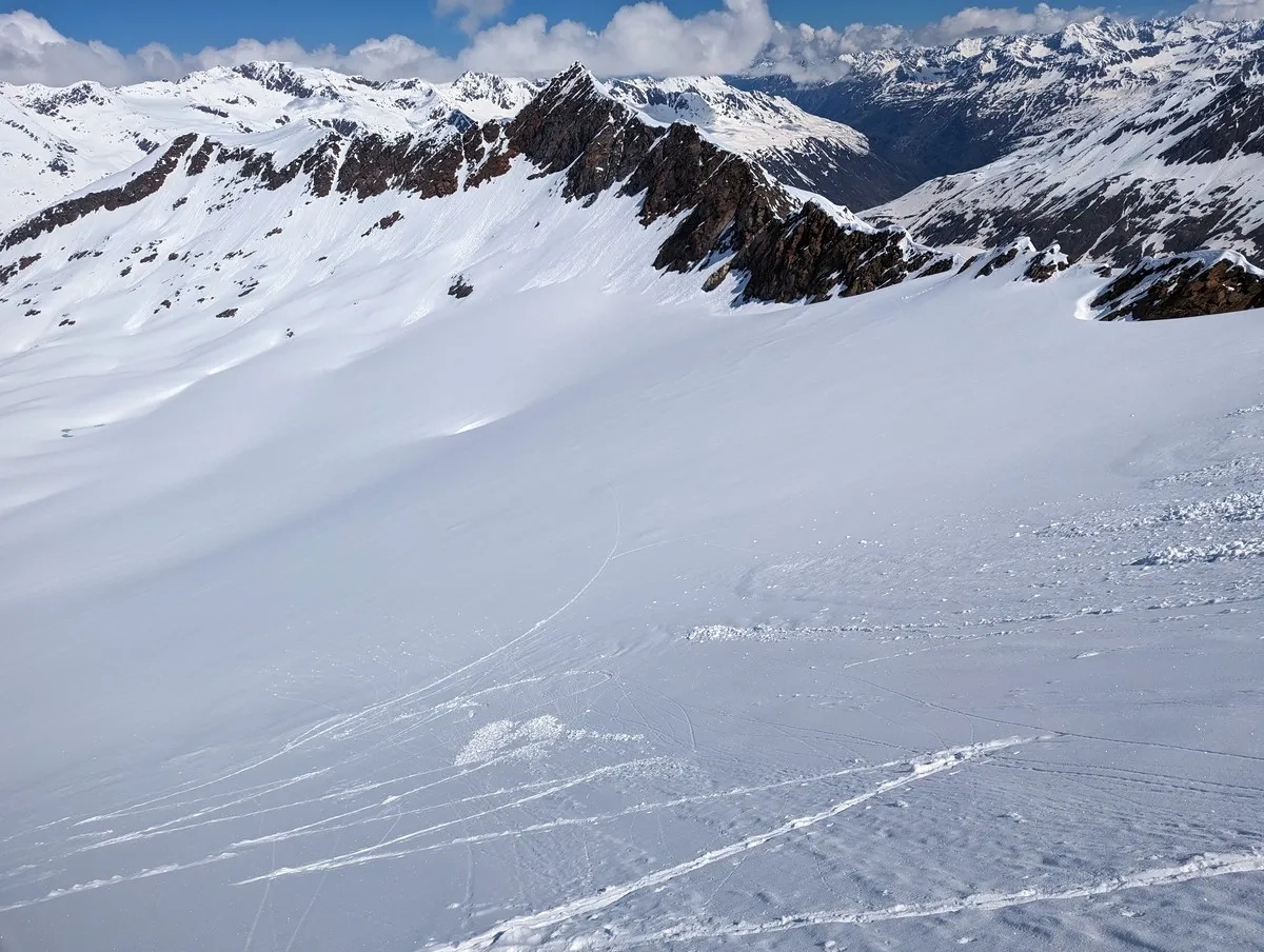 In der Abfahrt vom Wasserfallferner nicht zu weit rechts halten (steile Felswände).